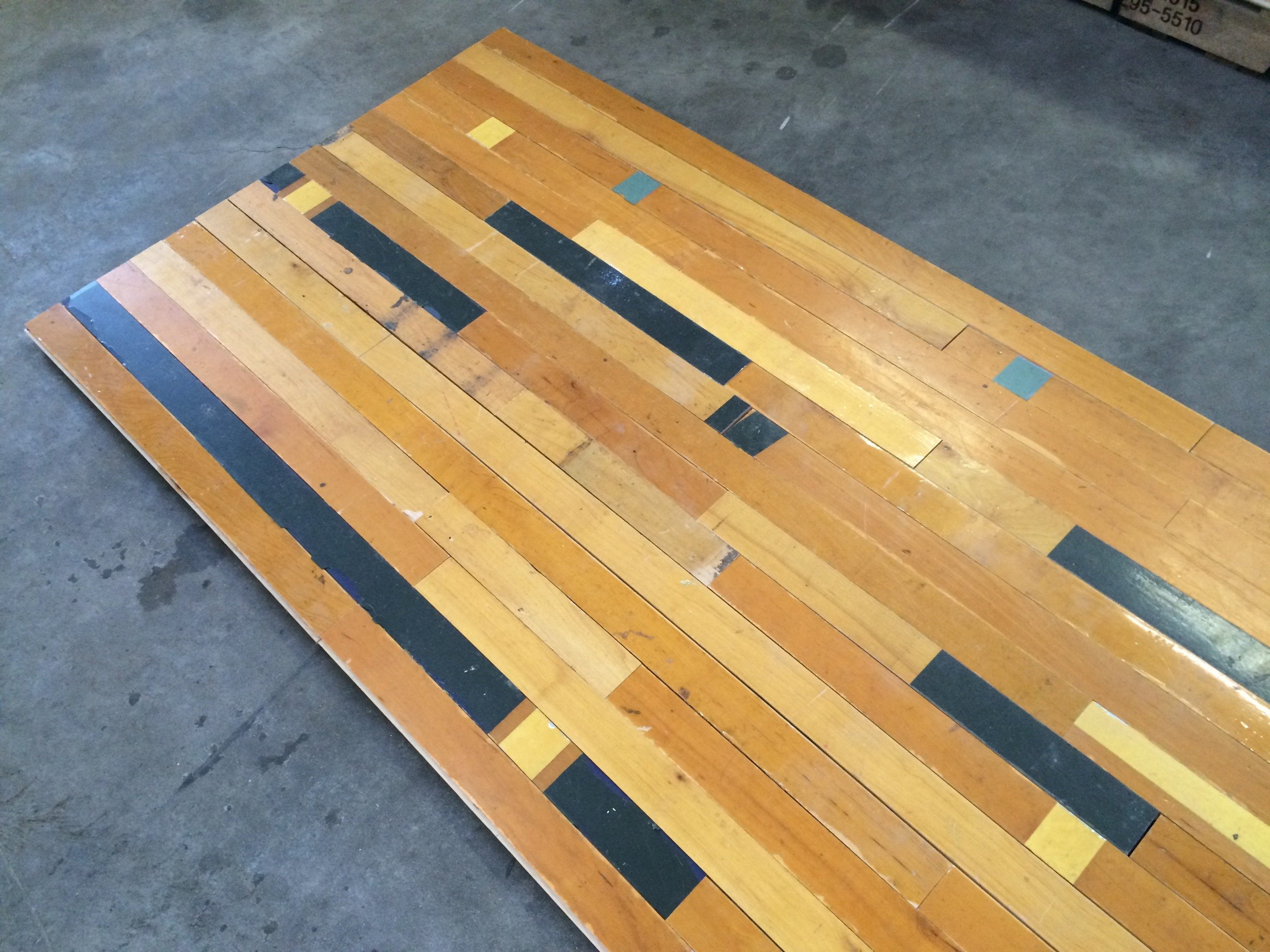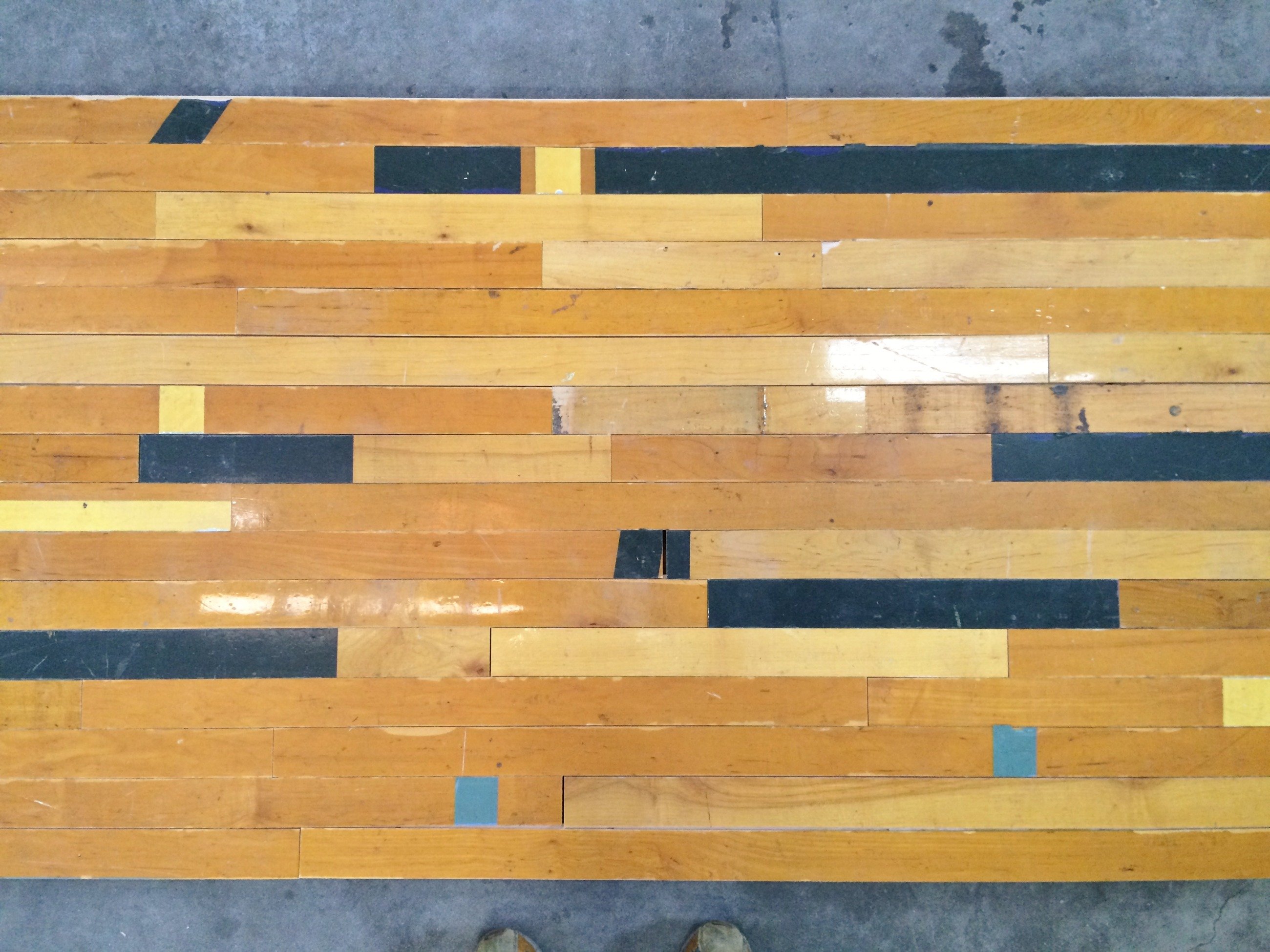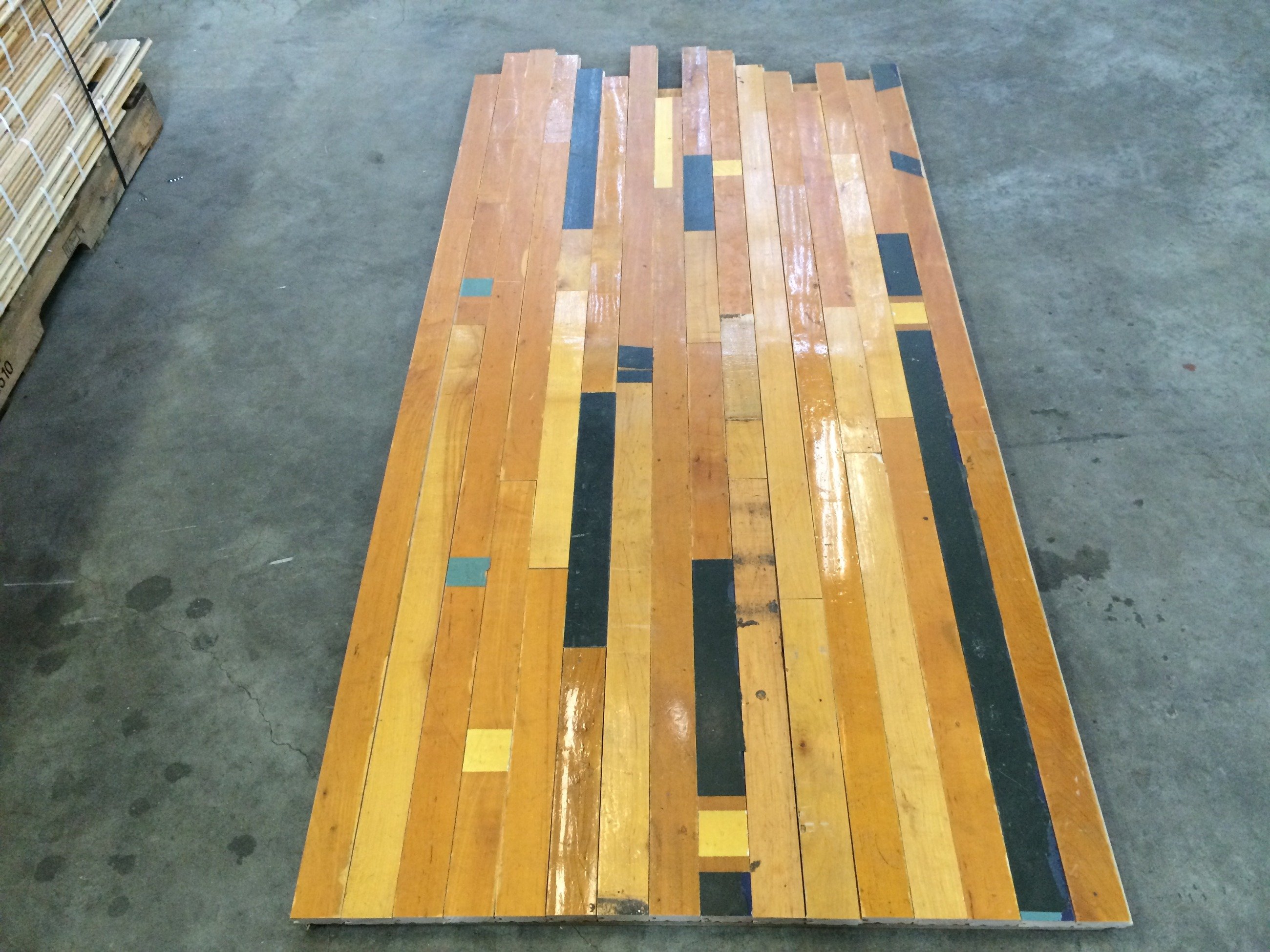 バスケットボールやバレーボールなど屋内スポーツが行われた体育館や運動施設から回収されたメープルフローリングです。カラフルなコートラインが空間に散りばめられ、軽快で遊び心のある外観を作り出します。