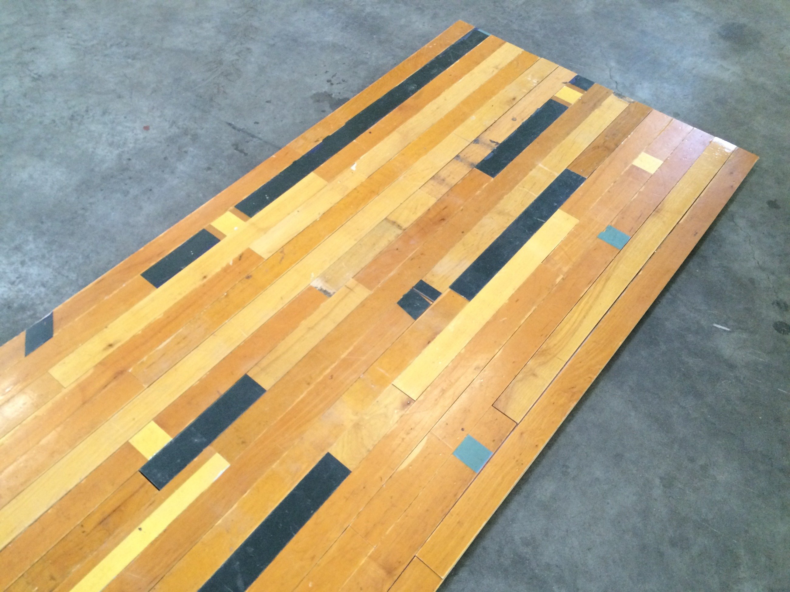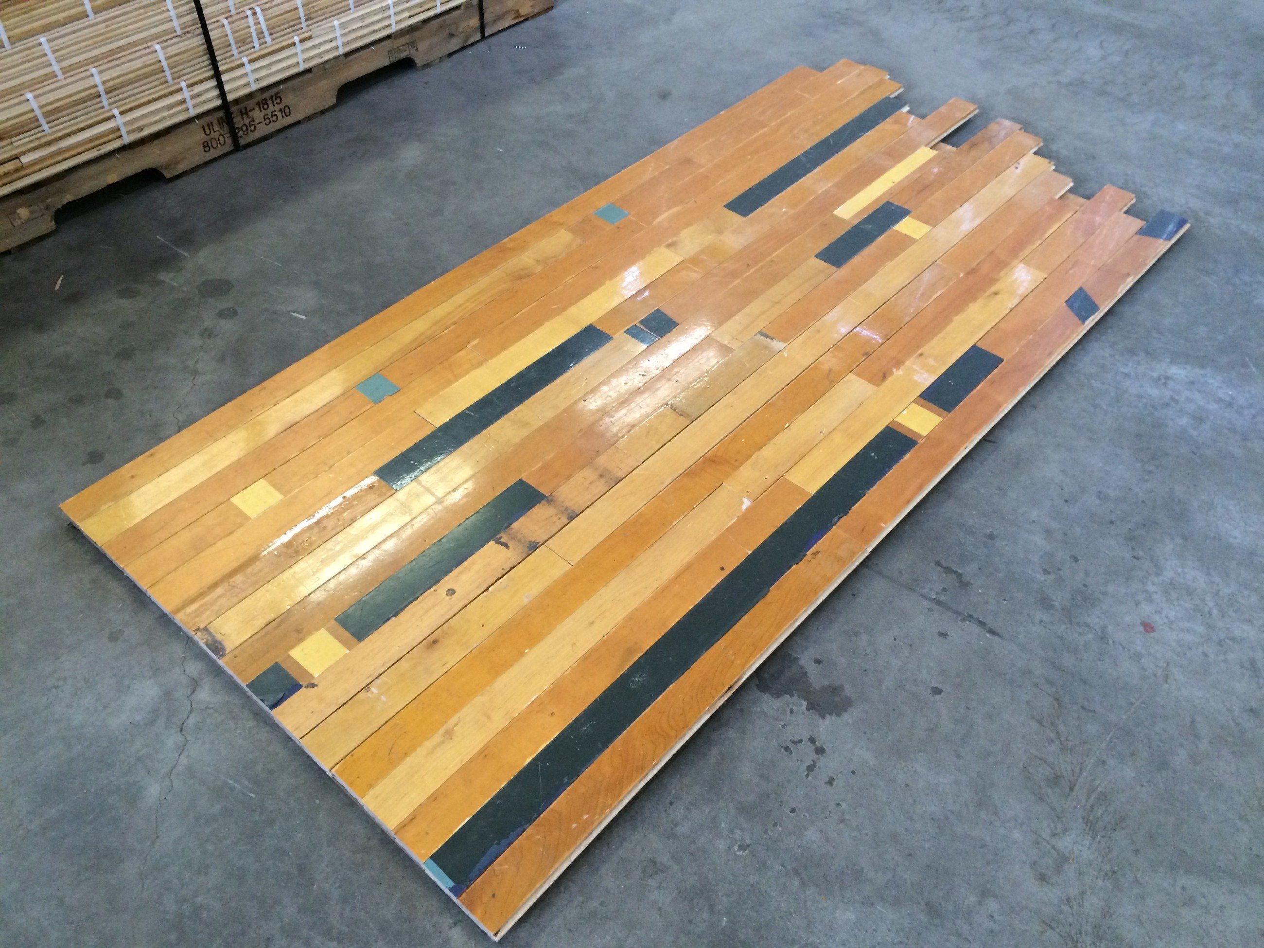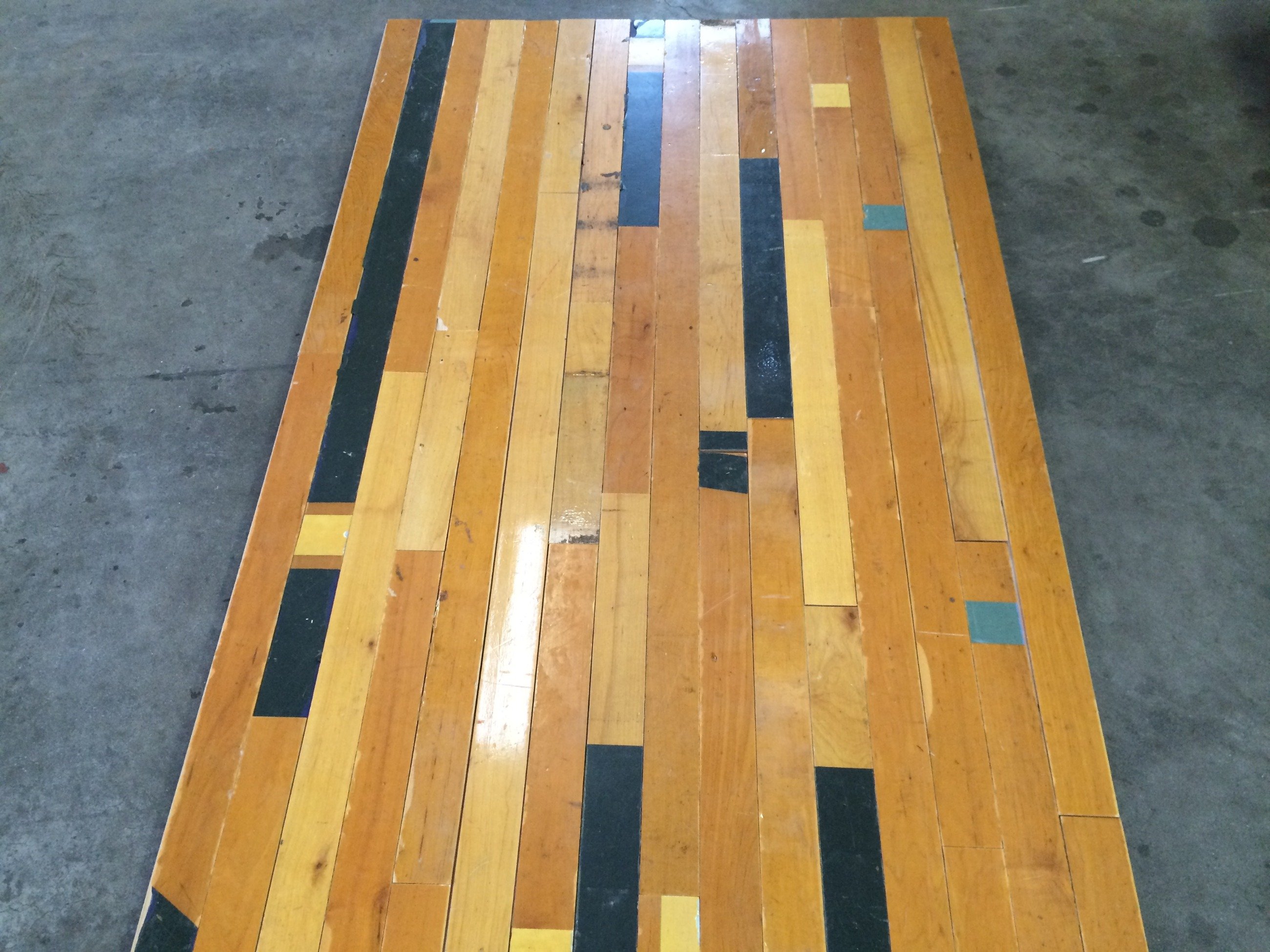 バスケットボールやバレーボールなど屋内スポーツが行われた体育館や運動施設から回収されたメープルフローリングです。カラフルなコートラインが空間に散りばめられ、軽快で遊び心のある外観を作り出します。