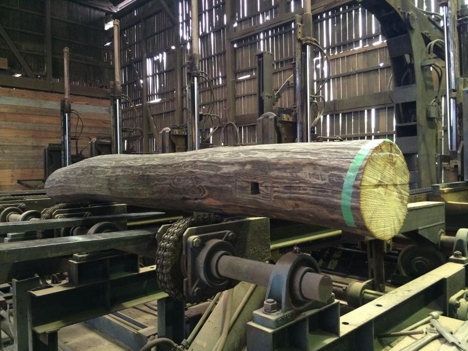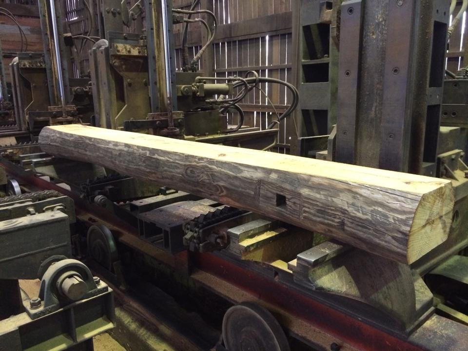 古材のどでかい丸太を料理して、古材の框(かまち)を作ります。