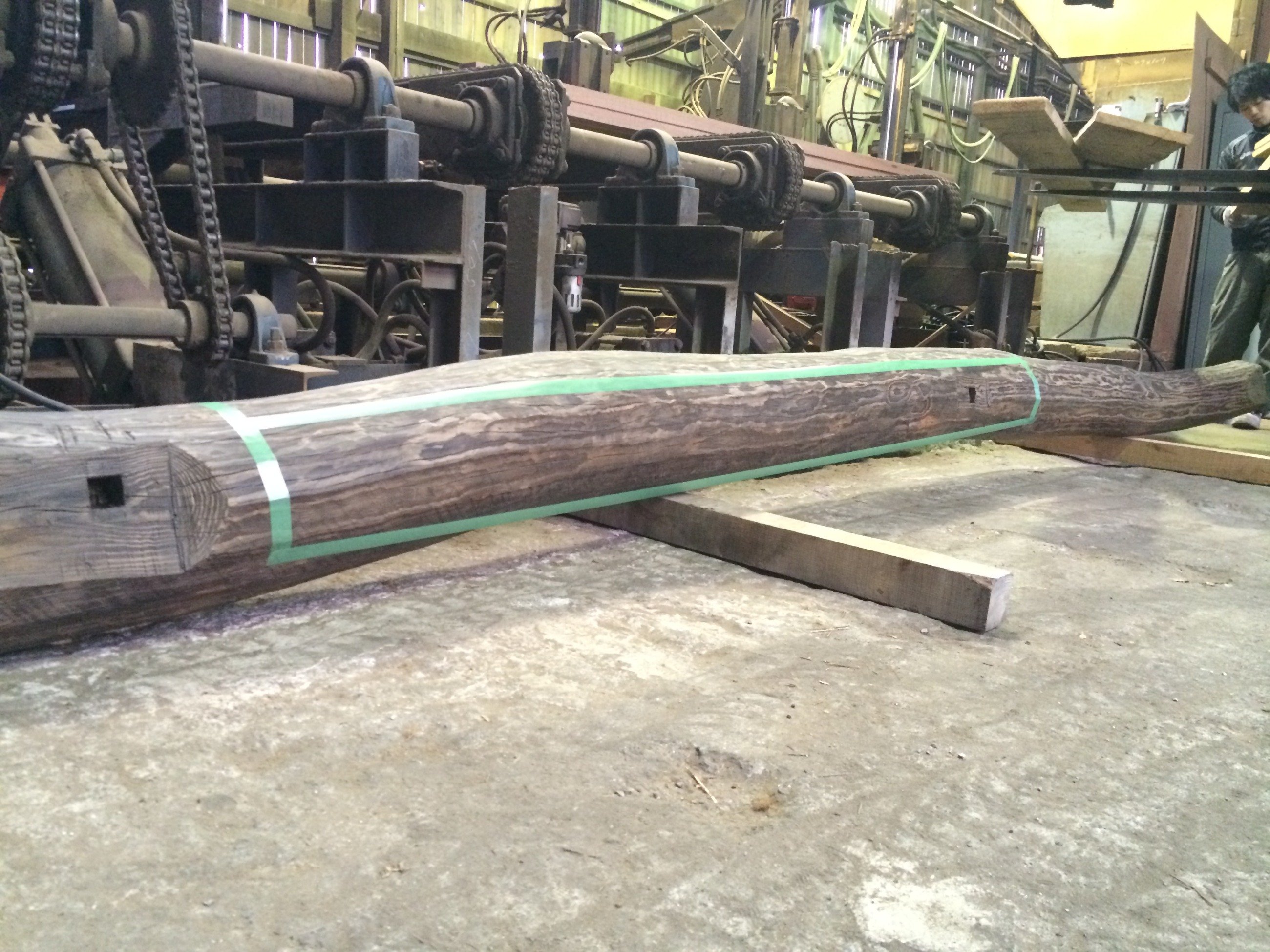 弊社が誇る全長14mの長さまでカットできる大型製材機にドンとのせて、、、