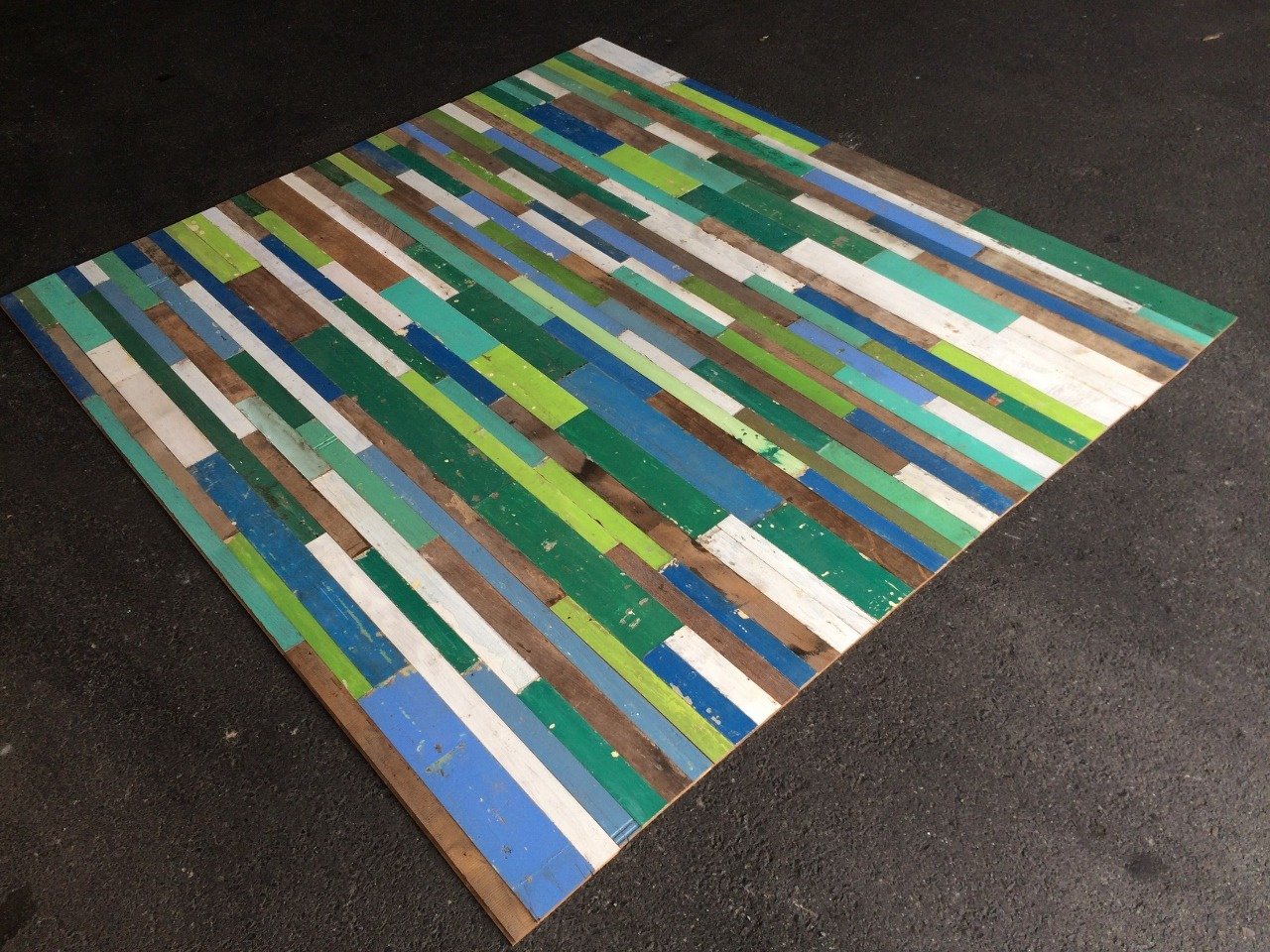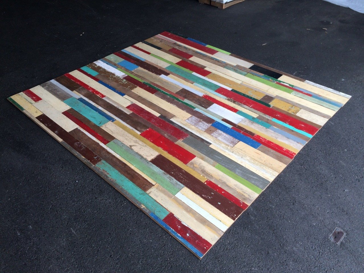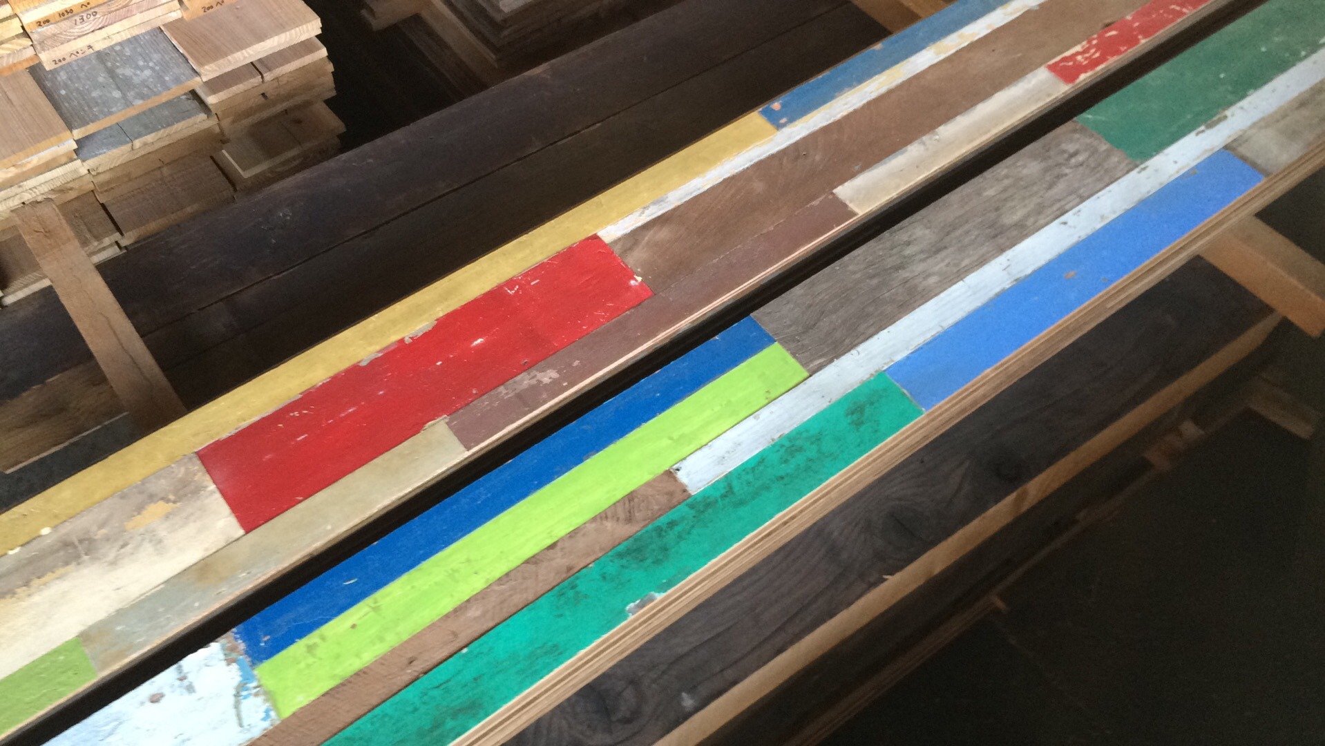 このカラフルな塗装が施された古材はインドネシアの古材なんです、材料はチークという高級材。
