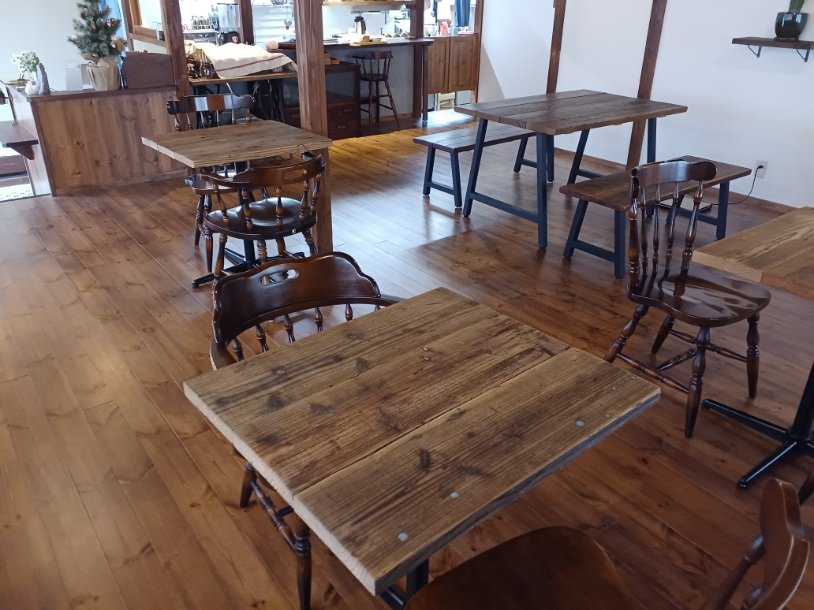 ソフトな古材感ですがテーブルとの相性はばっちりです。