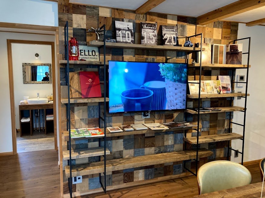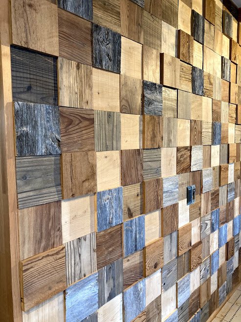 古材の板材を張るのではなく、梁材を製材カットし敷き詰める。古材の重厚感と自然美が、壁に命を吹き込み、様々な表情を生む。 個々の異なる風合が色彩を、凹凸が陰陽を生み出す。 ライティングと自然光で、一日中少しずつ表情を変化させる古材の壁は、一世紀前の匠の技術と、現代のデザイナーの感性が生み出した、唯一無二の作品となる。