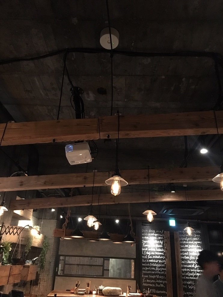 中に入って見上げると古材の梁、 そしてユーズドプレーン(足場板)のテーブルが。