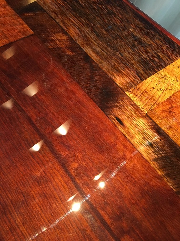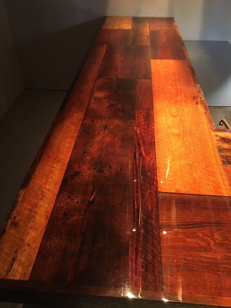 ピッカピカですね! 古材と古材の隙間から樹脂が流れ出ないように、埃が中に入り込まないようにとても気を遣った作業だったと思います。
