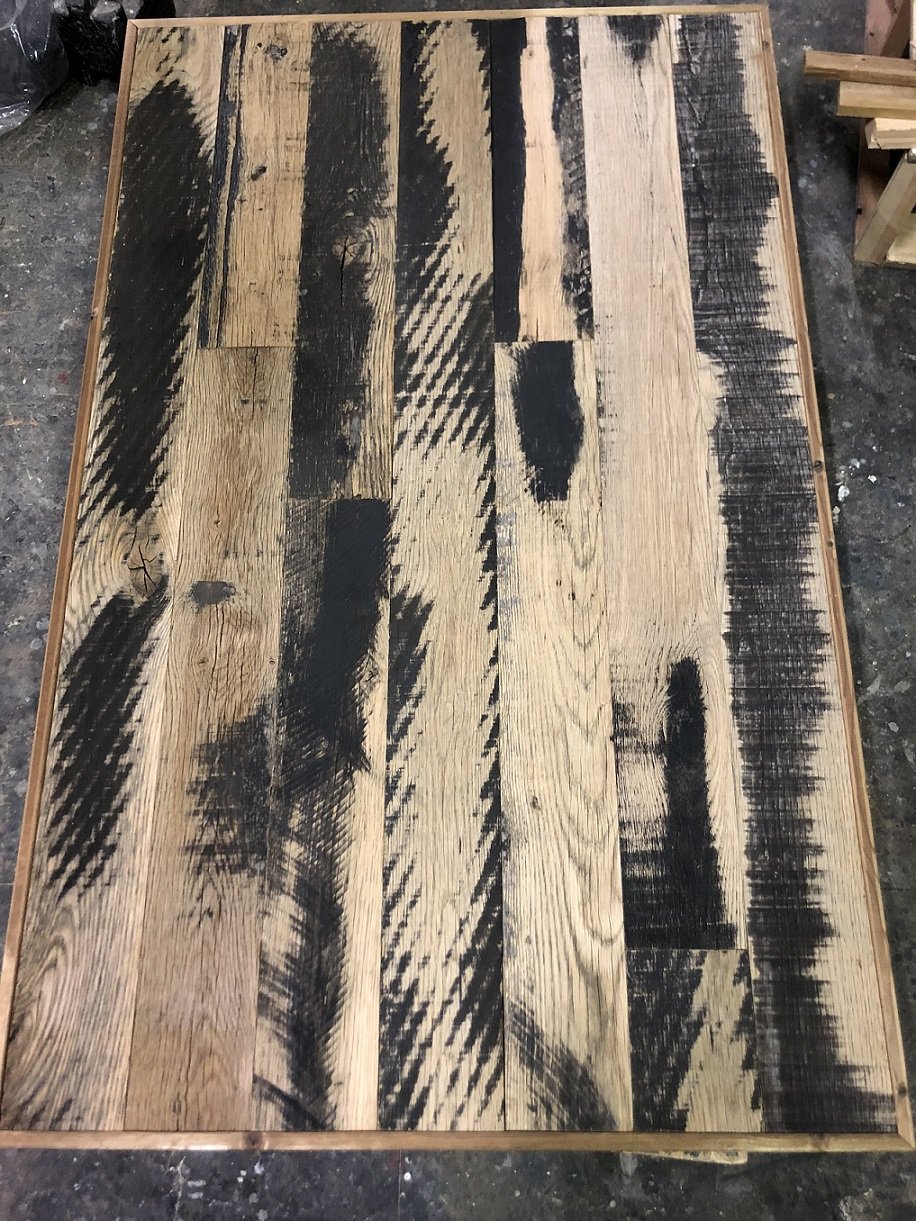 古材で天板を作る場合、 元々厚みのあるものを接いで作る方法と、 ランバーコアなどの下地に板やフローリングを貼る方法があります。