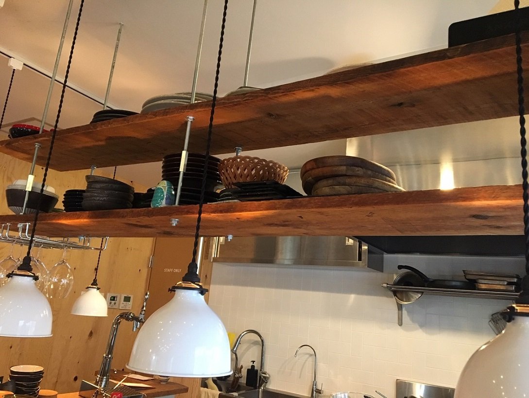 L字カウンターはUSボード2インチを、カウンター上の小皿やコップがずらりと並んでいる笠木部分はUSボードオークを、 上部の吊板はUSボードブラウンを使っています。
