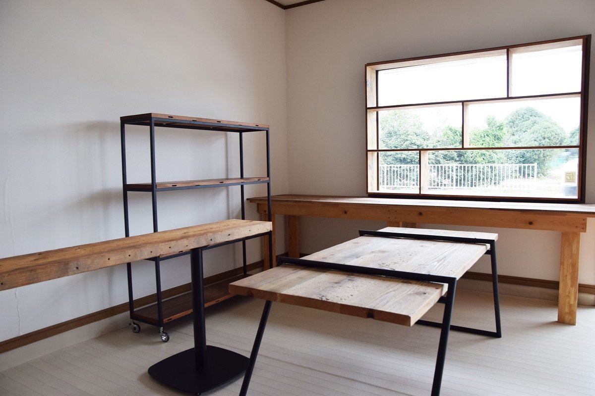 窓際にあるテーブルの天板、 そして出窓の枠と棚も古材で作られています。
