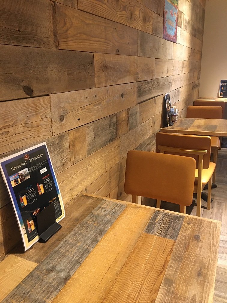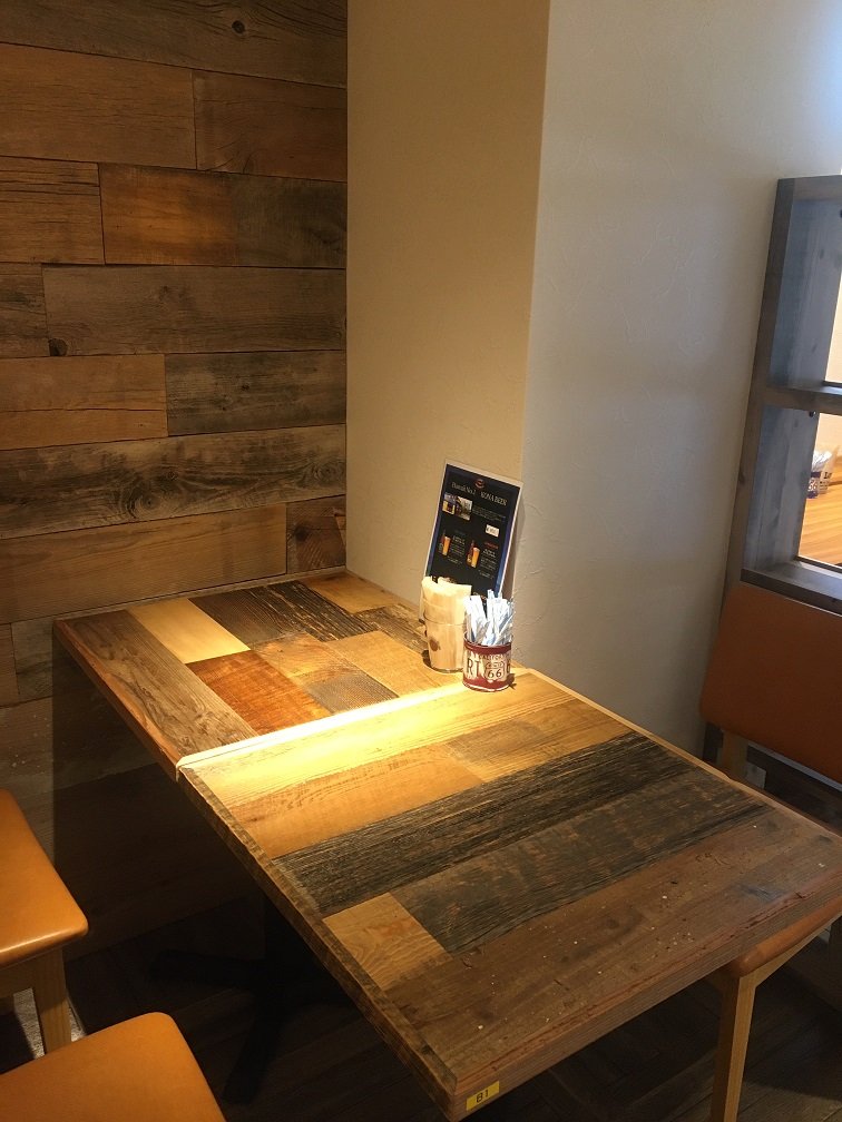 勿論このテーブルも古材日和オリジナル商品。 壁と同じ風合いの古材を使っているからこれまた違和感なし!