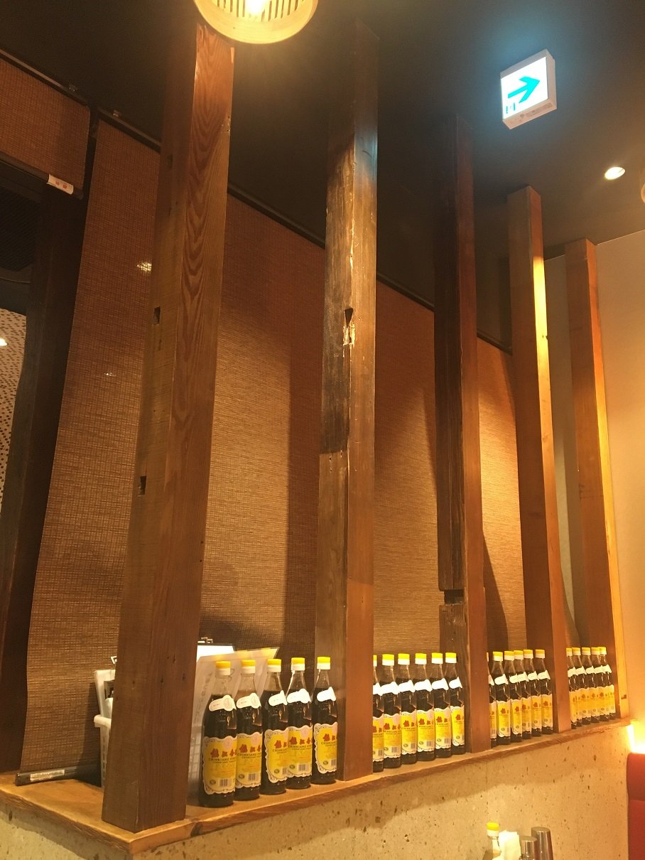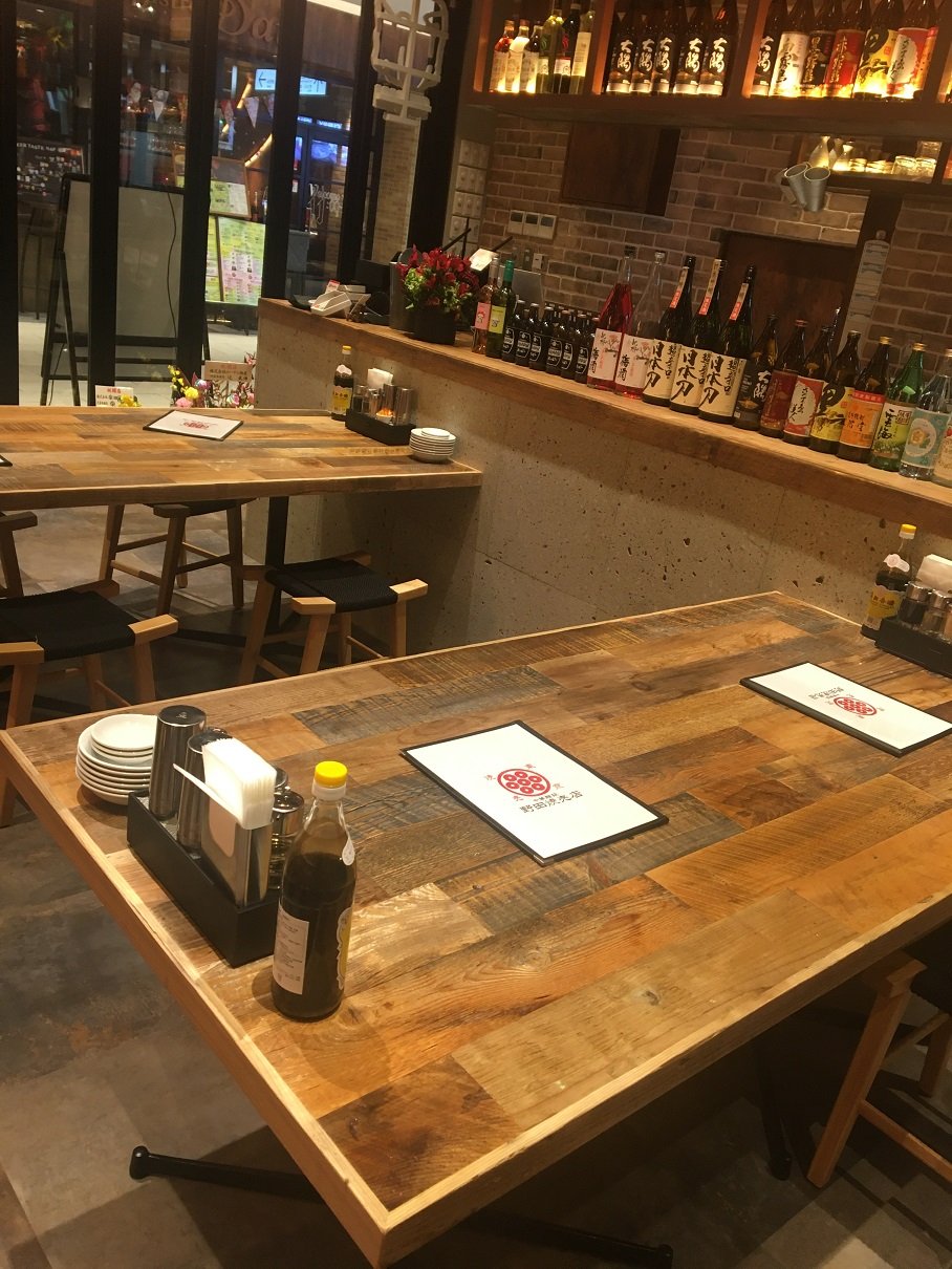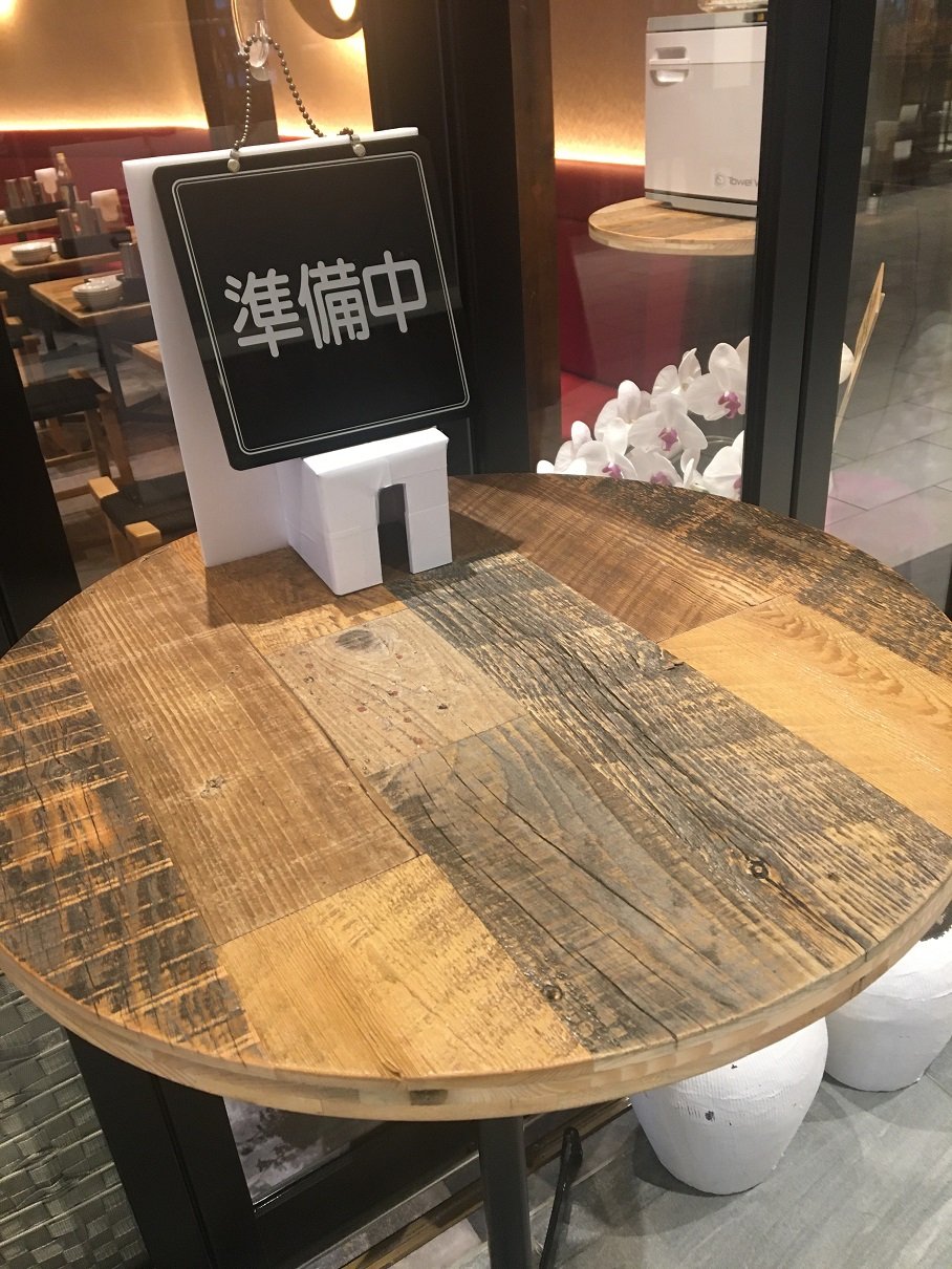 カウンターにはUSボードのブラウン・2インチを。 ボーダータイプのテーブルは大小円形合わせて16台!