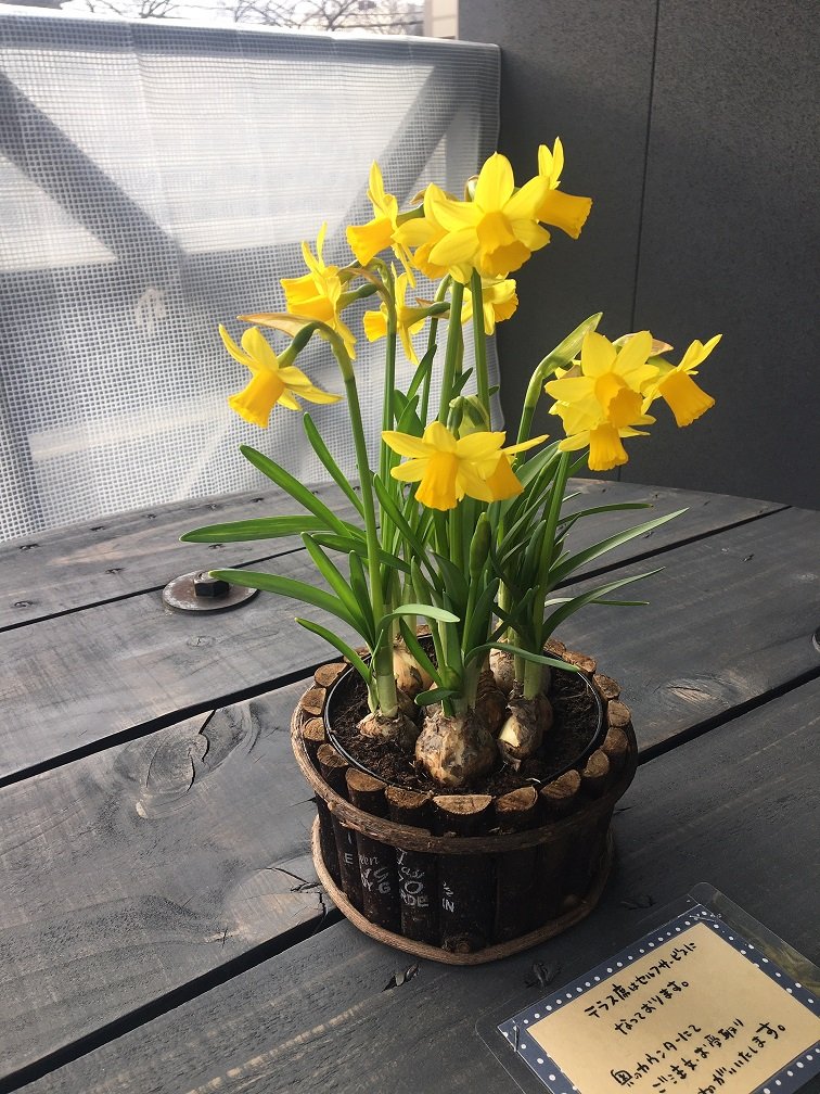 テラス席には 中古の木製ドラムがテーブルとして使われていました。