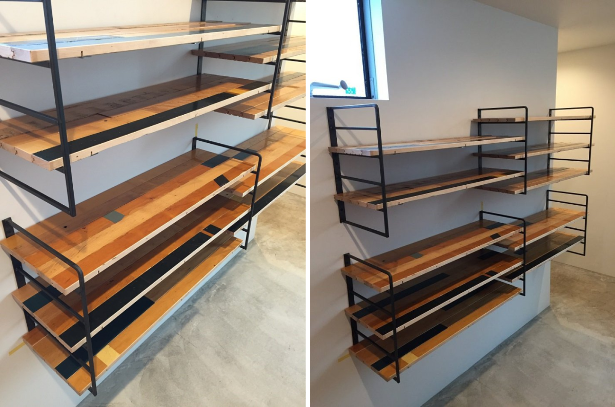 ジムフローリングを棚板に使っていただきました。剥がされたフローリングには実際の使用による傷や歪みが見受けられ、独特の風合いを生み出しています。歴史的価値と個性的な状態が、棚作りにおいてもカラフルなコートラインが空間に散りばめられ、軽快で遊び心のある外観を作り出します。