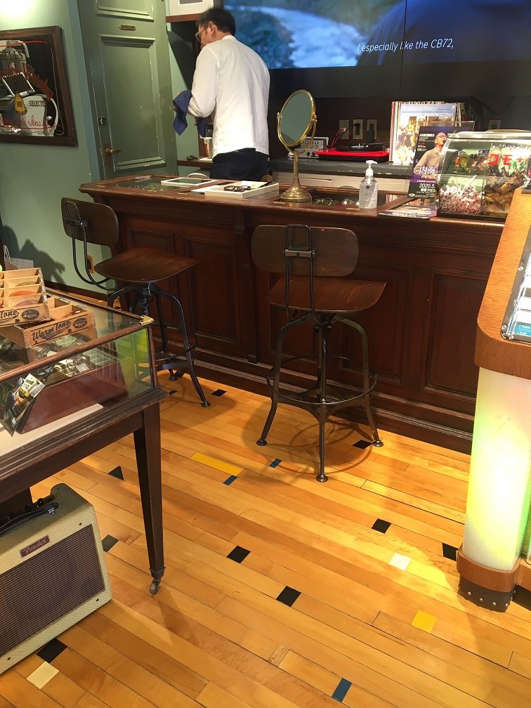 店装にはアンティークの視力表やアコースティックギター、 そしてアナログレコードのBGM...