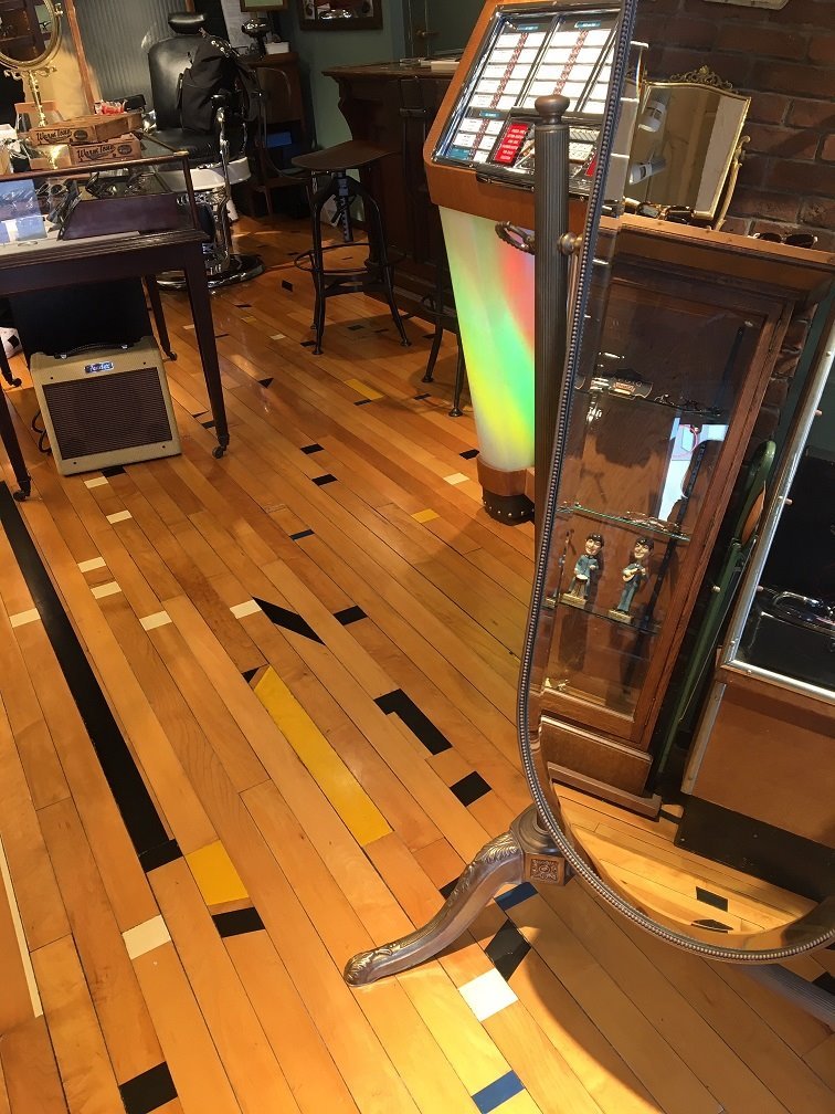 バスケットボールやバレーボールなど屋内スポーツが行われた体育館や運動施設から回収されたメープルフローリングです。カラフルなコートラインが空間に散りばめられ、軽快で遊び心のある外観を作り出します。