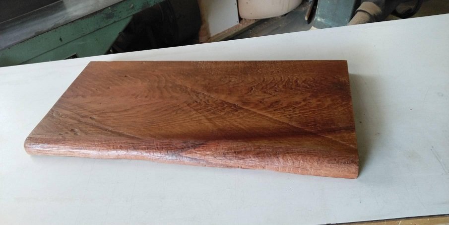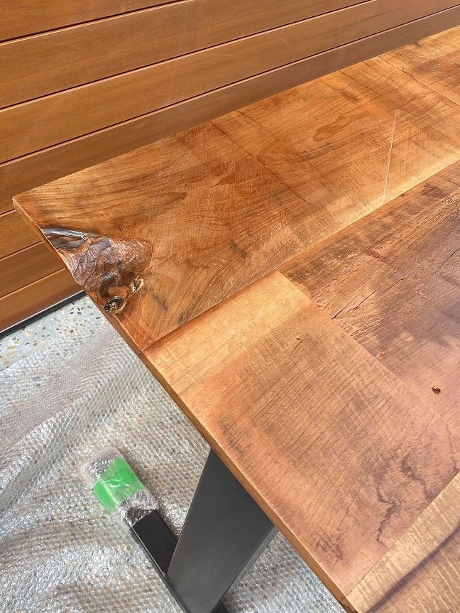 「ここのこの木目は是非入れて欲しいわ」「このえぐれたところも自然な感じで凄く好きなので手前に」「ここの、 これも絶対残して」などなど、お客様のご要望をそのまま加工屋さんに伝え、製作したものが先日納品となりました。