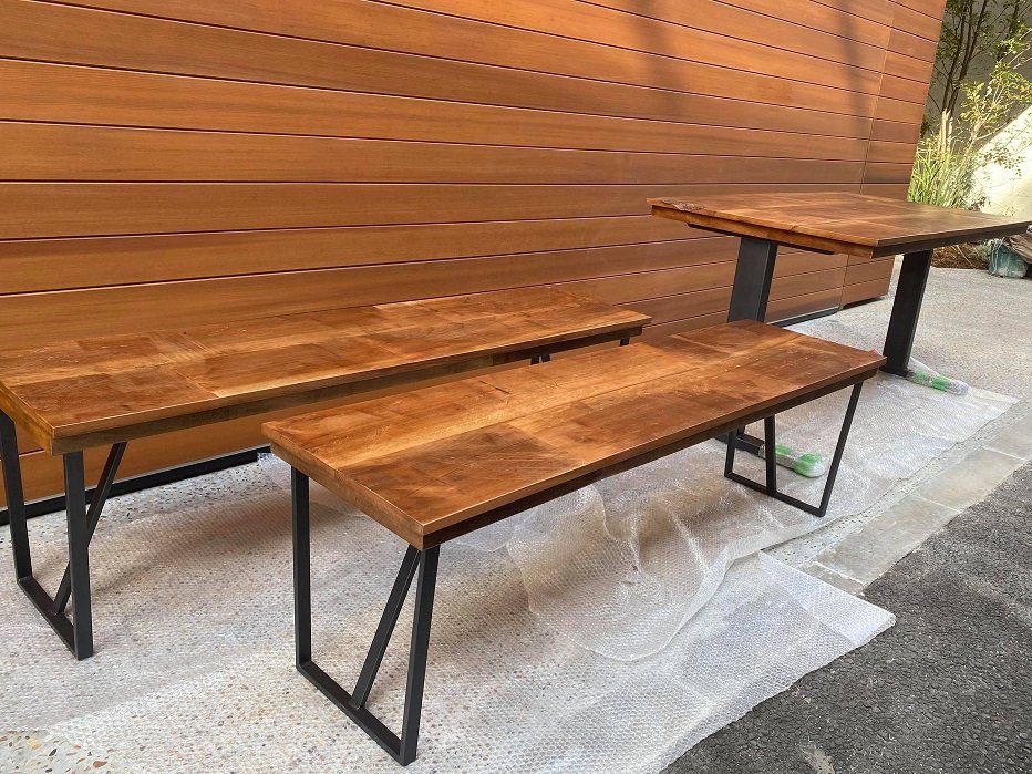 テーブルとベンチは艶消しのウレタンクリア仕上げ ニッチ用の板は艶消しのクリアラッカー仕上げです。