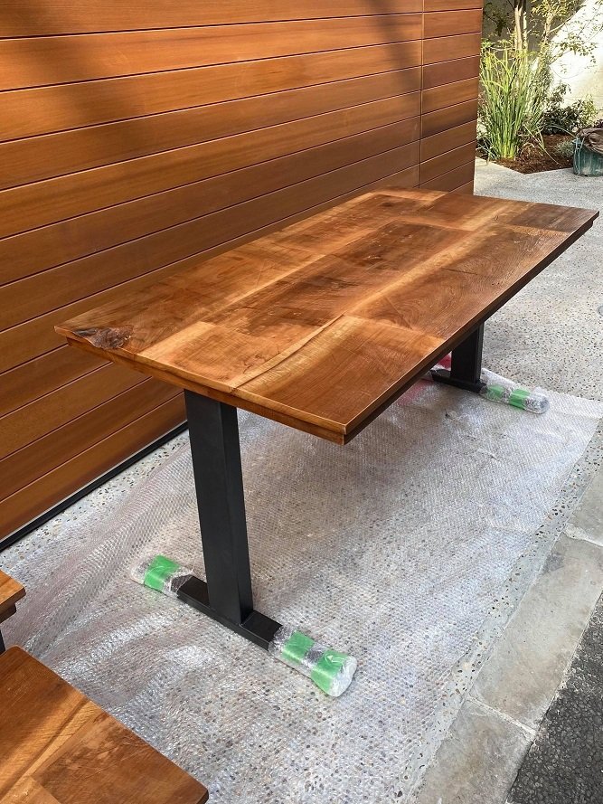 テーブルと言っても色々な加工方法があるのですよ。 厚板を幅接ぎしたり 合板下地に古材を貼ったり、、、