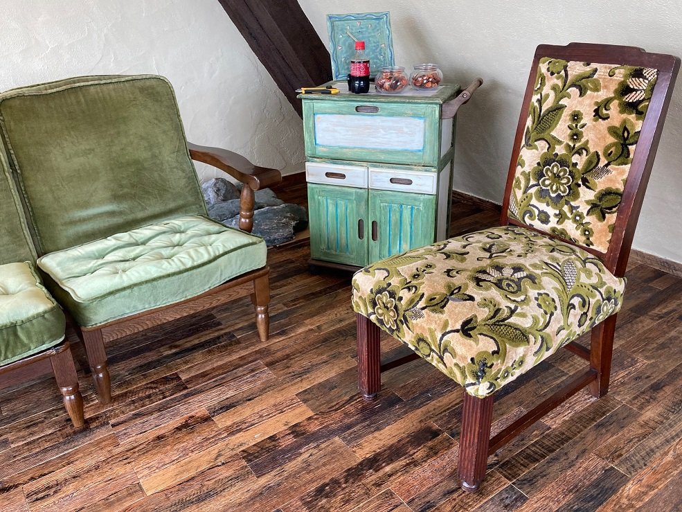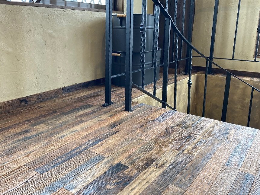 古材では希少なヘリンボーンタイプ。エンドマッチを付けることで誤差や歪を最小限に抑えています。オーク古材の風合いを十分に保ちつつ、ブラッシングとサンディング処理によりささくれやケバを抑え、風合いと実用性の両方を重視した商品です