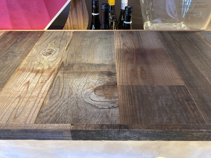 ただカウンターに使う場合、どうしても表面の毛羽立ちを抑えるためには削る必要があり、グレー系の古材は削ることによってグレー色が落ちて木の元の色味が出てきてしまう。