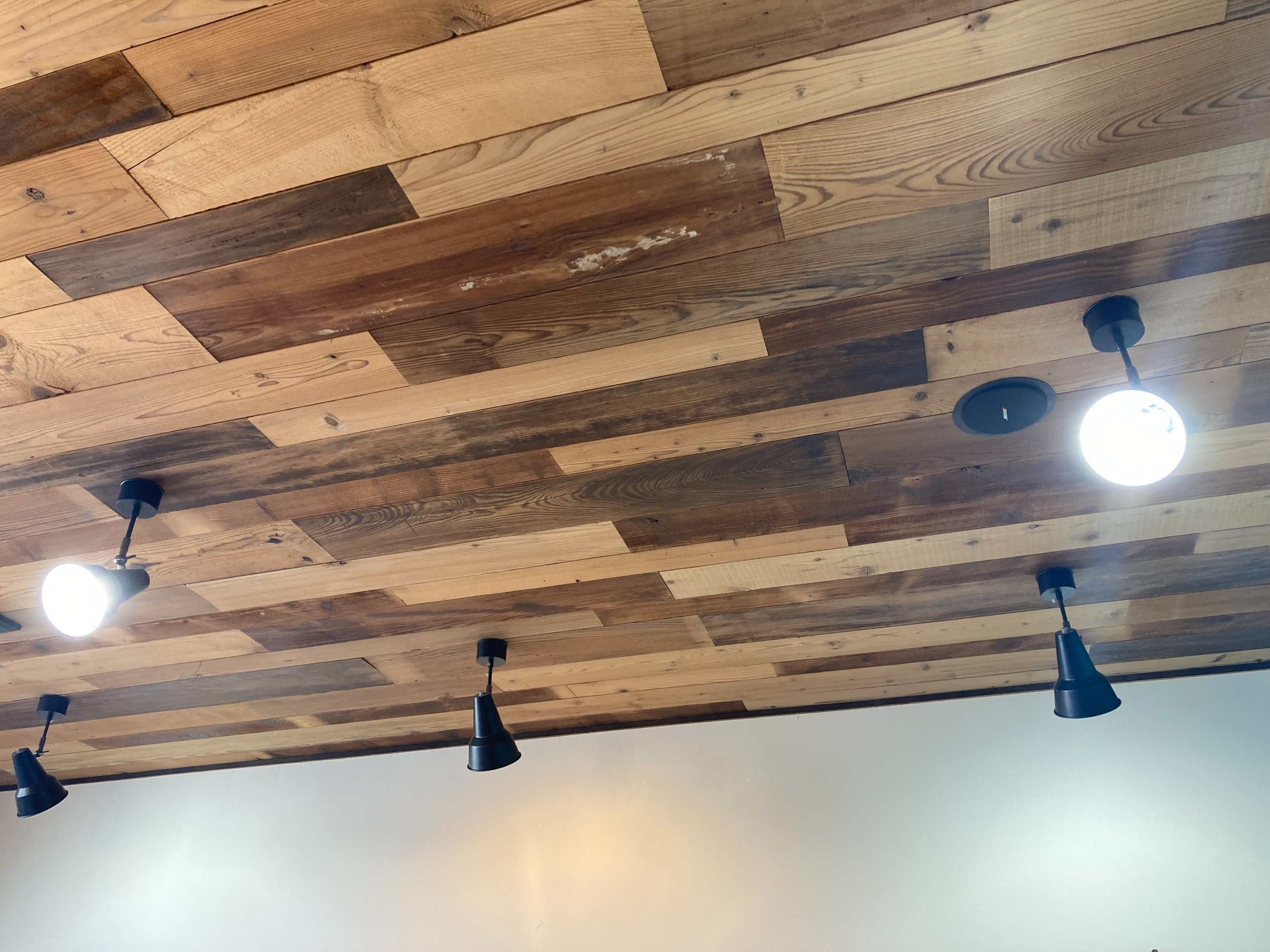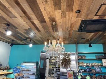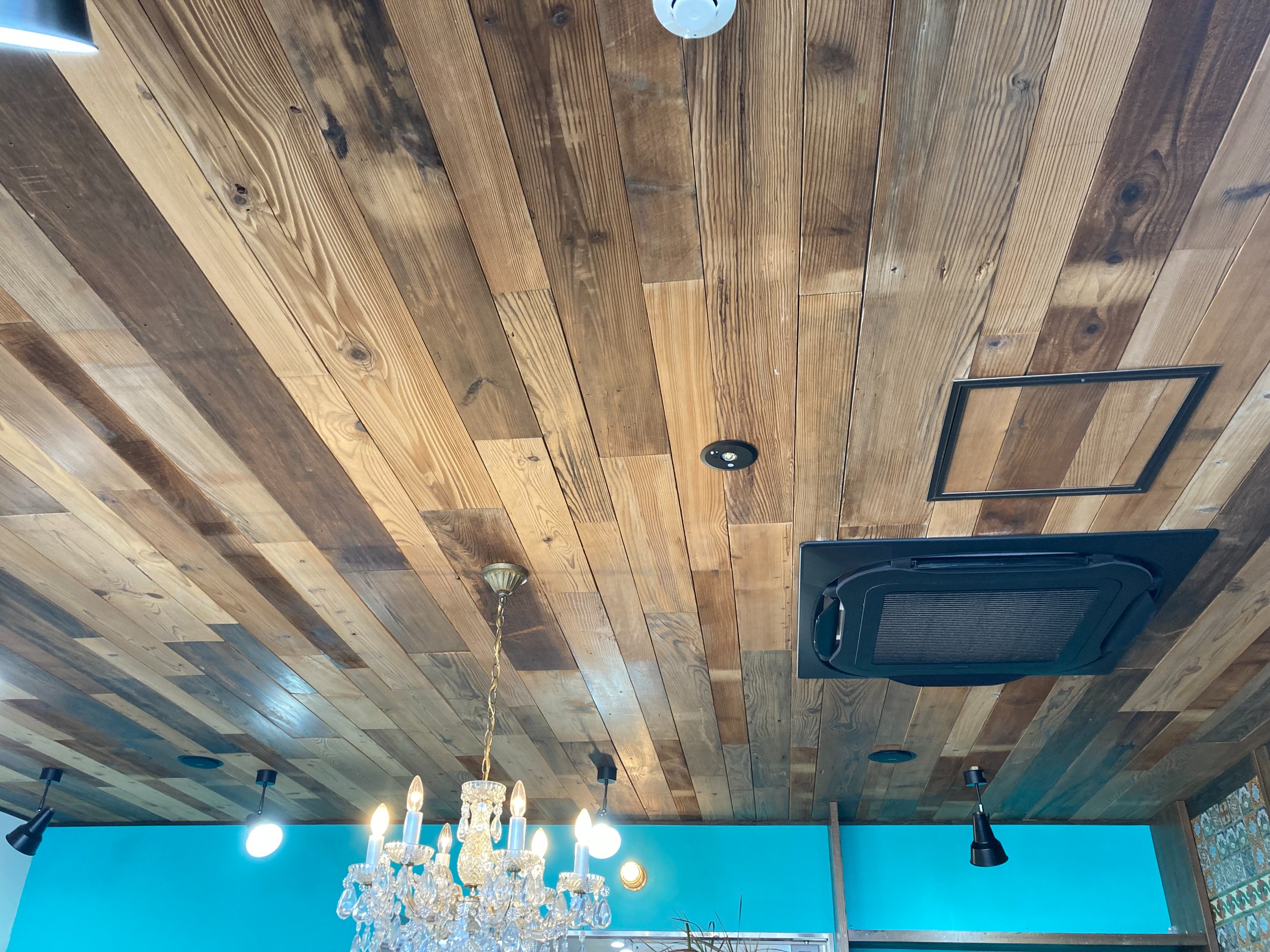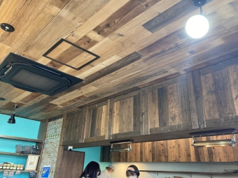 カウンター腰や棚の扉にも古材を使っていますが この度は天井にクラシコ不燃を採用して頂きました。