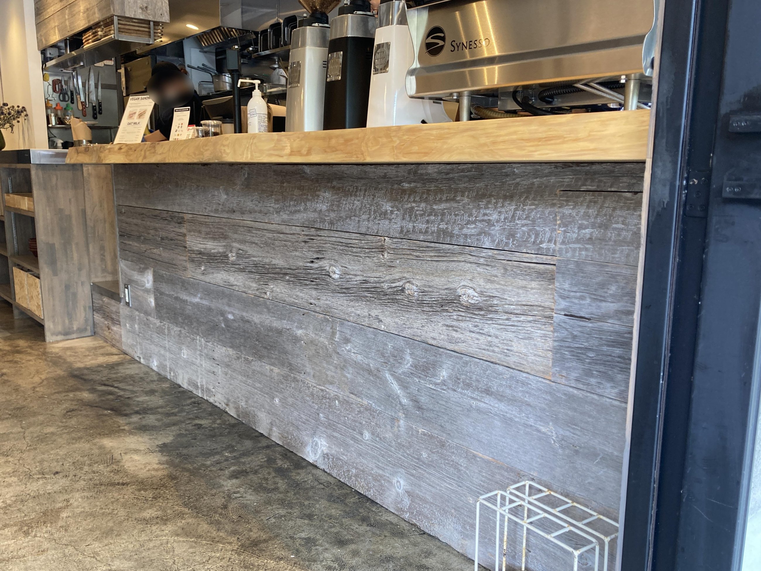 店舗入り口からカウンターの腰壁・奥の壁面や什器など ふんだんに使って頂きました。