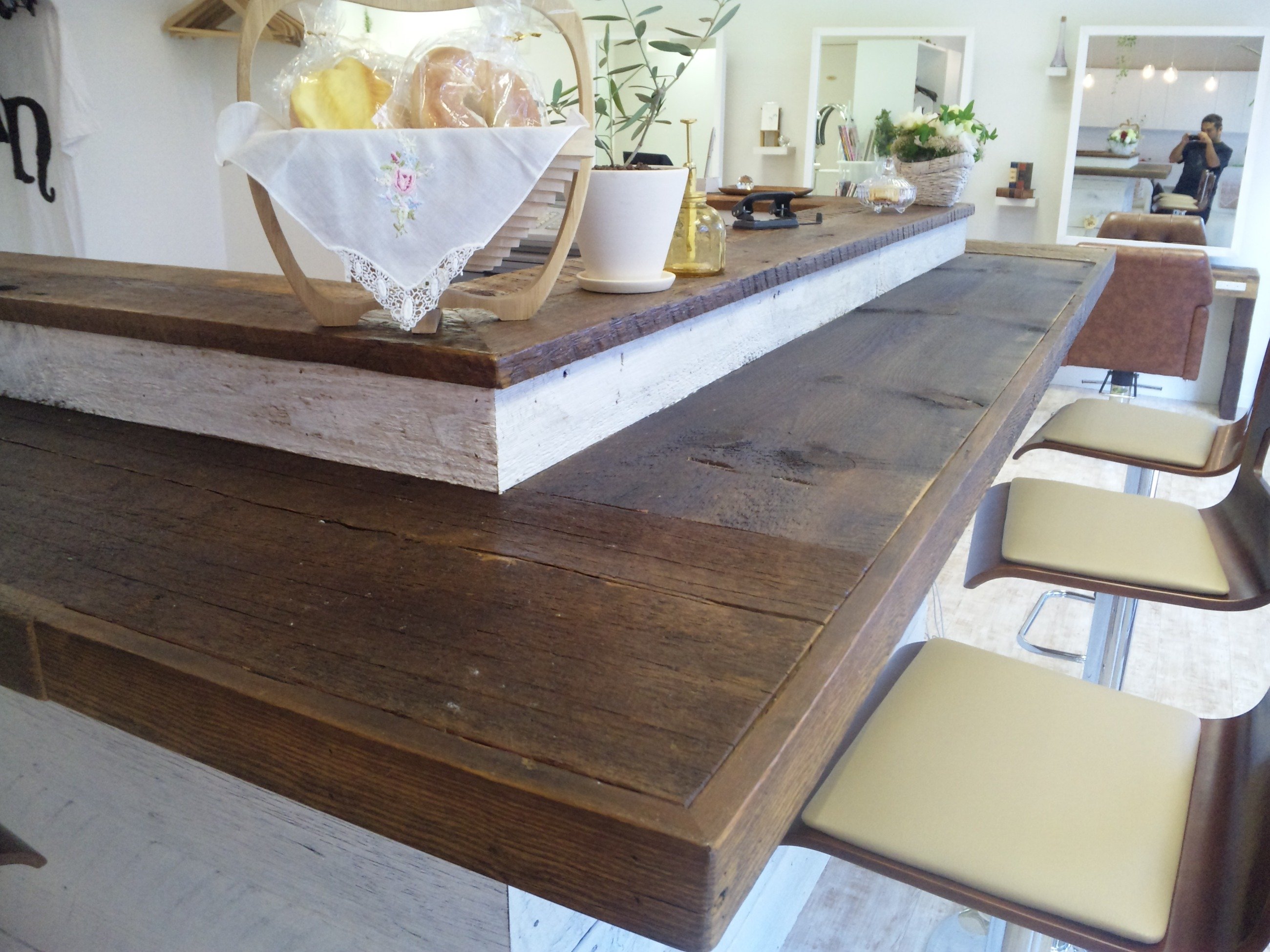 カウンターだったり床だったり壁だったり、、、 使用している古材も様々ですが、使用用途もお店によってバラバラです。
