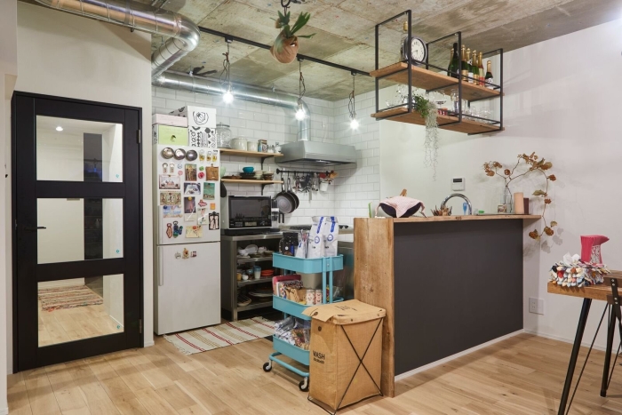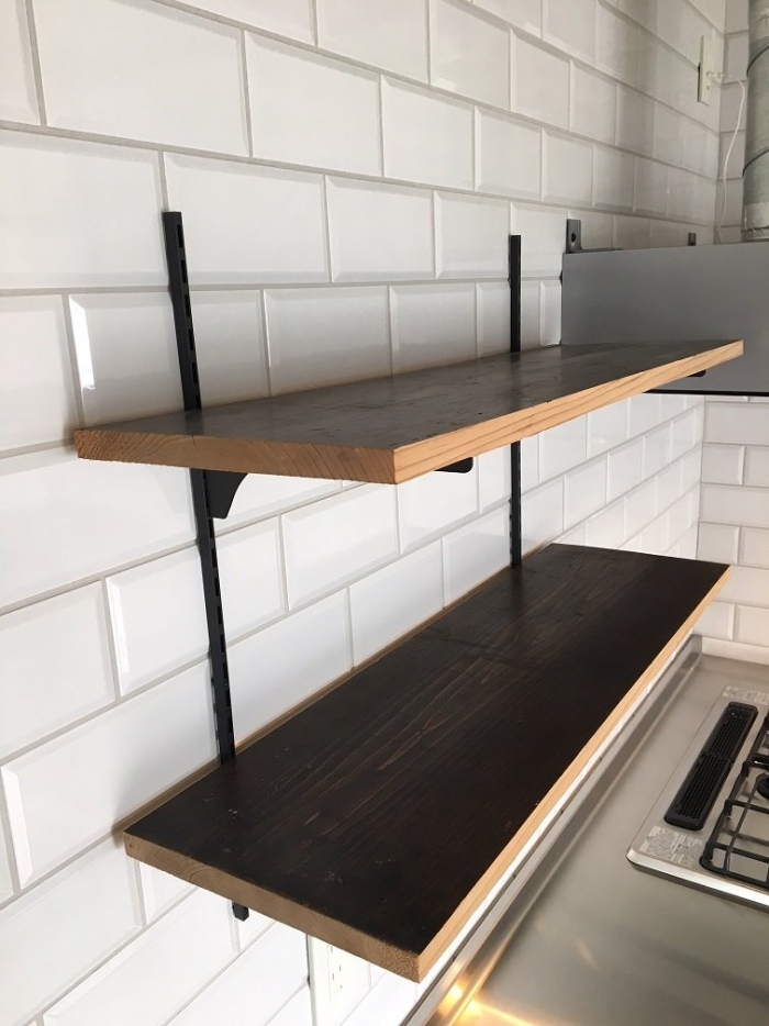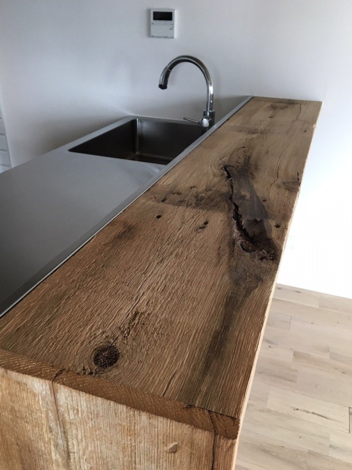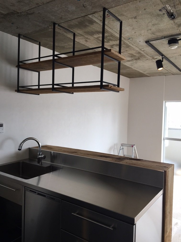 マンションリノベーションでキッチンカウンター・棚板に使った事例です。