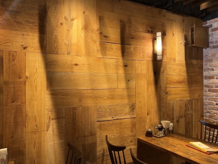 USボード ブラウンに不燃処理を施し、不燃材料として仕上げました。公共施設や百貨店・ショッピングモール・アーケード等の商業施設など、不燃材料の使用が義務付けられている場所においても古材を利用することができます。
