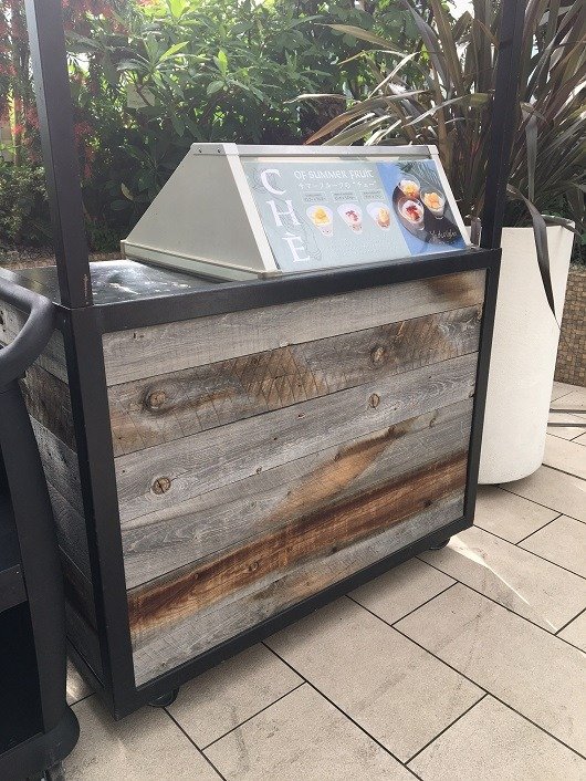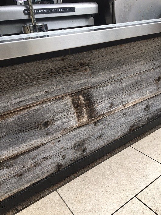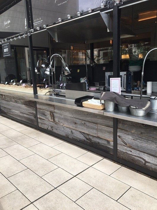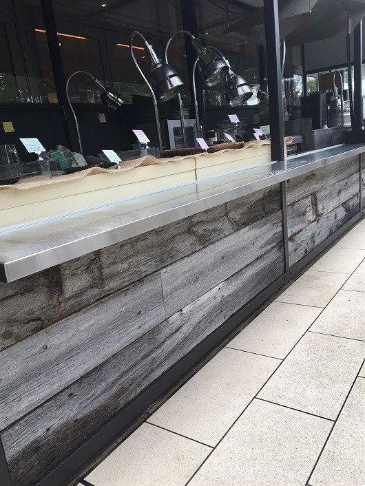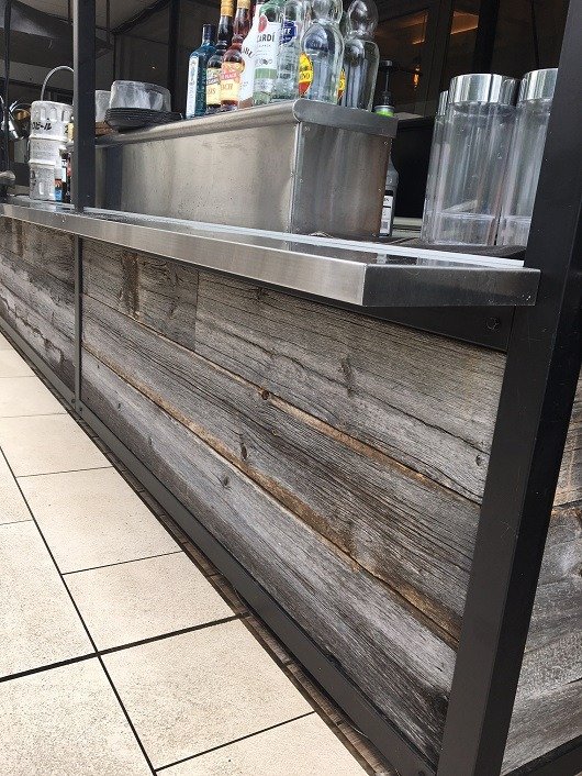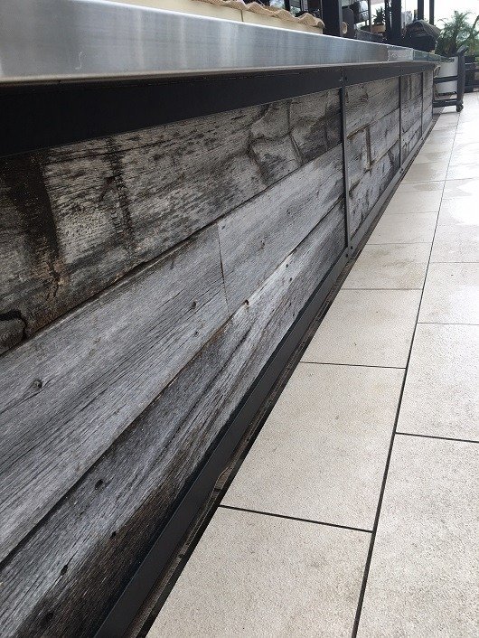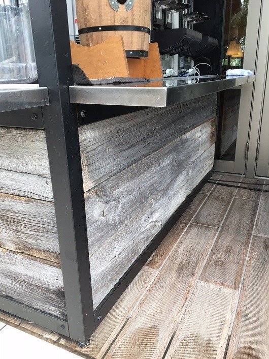 お店のテラスにUSボード・グレー(バーンウッド)