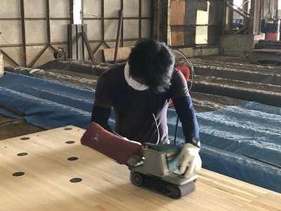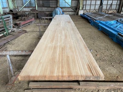 香川県のボウリング場で50年前にレーンとして使われていた材です。解体時にはできる限りカットせず、そのままの姿で引き上げました。樹種はパインとメープルから構成されており、レーンの表面をカンナで削ると美しい木目が現れます。全長7m以上、巾は1m以上、テーブル等の用途に最適です。
