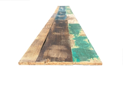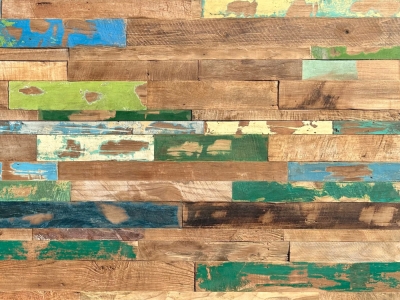 インドネシアの古民家の外壁として使用されていた高級材「チーク」を再利用して製作した商品です。当時の富裕層は住宅を保護する目的で外壁に塗装を施しており、現地特有のカラフルな色合いが特徴です。厚みが薄いため非常に使い易い仕様となっており、壁面や什器など様々な用途にご利用いただけます。