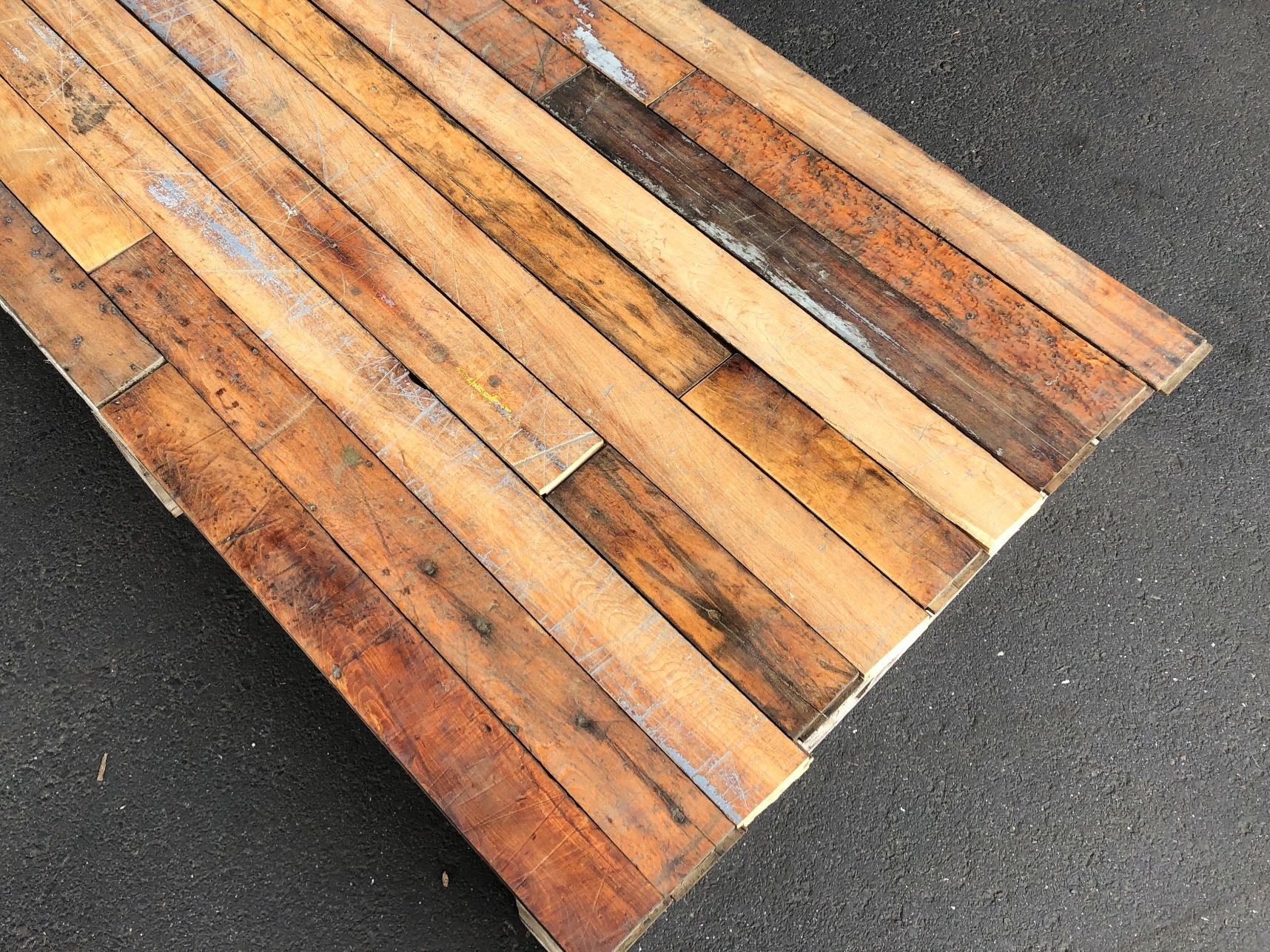 アメリカの鋳鉄工場を主とする工業用工場の床材です。重量物を扱うため耐久性のあるメープル材が使用されています。厳しい工場環境で長年使用されたことによって生み出された重厚感と深みには、そこで働く人たちの風景がよみがえるほどの言葉では伝えきれない歴史と力強さをまとったオーラがあります。