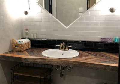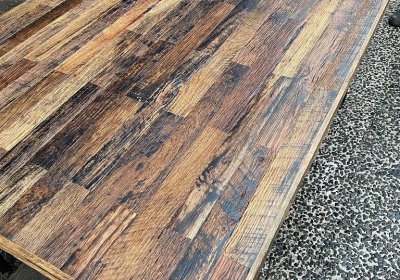 古材では希少なヘリンボーンタイプです。サネ加工(本実・エンドマッチ)を施すことで反りや歪を最小限に抑え施工することが可能です。ブラッシングとサンディング処理により表面のささくれやケバを抑え、古材の風合いを十分に保ちつつ実用性の高い仕上がりとなっています。