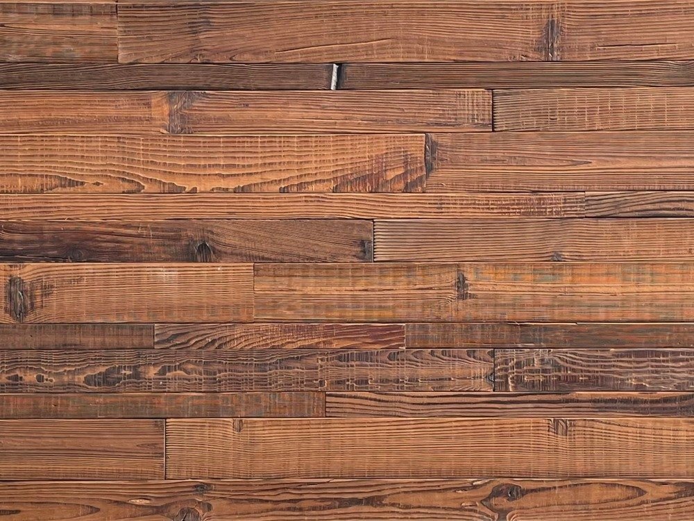 古材を素材としてとらえ、古材丸太や角材から上質な部分を切り出して作り上げた商品を MOQGs(モクジス)と名付けました。その貴重な素材にサーモ処理(高温熱処理)を施し、寸法安定性・耐朽性・断熱性を高めました。水分を含みにくいためキッチンや手洗い場等の水回りへの利用が可能です。また機能面だけでなくサーモ処理による独特の色合いや、木目を浮きあがらせた美しい仕上がりも魅力の一つです。