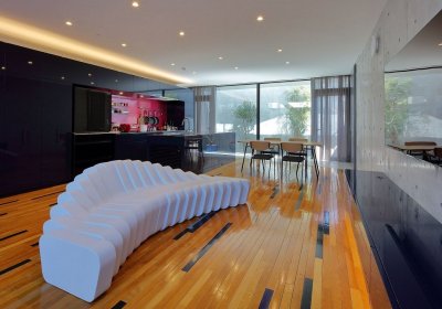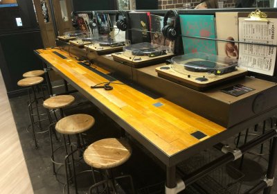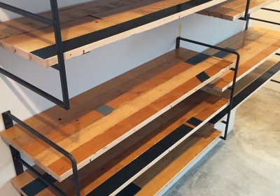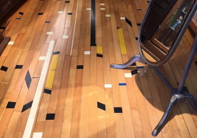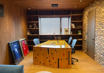 アメリカの体育館のフローリング材を回収した貴重な素材です。バスケットボールやバレーボールなどのカラフルなコートラインが散りばめられ、軽快で遊び心のある表情を作り出します。