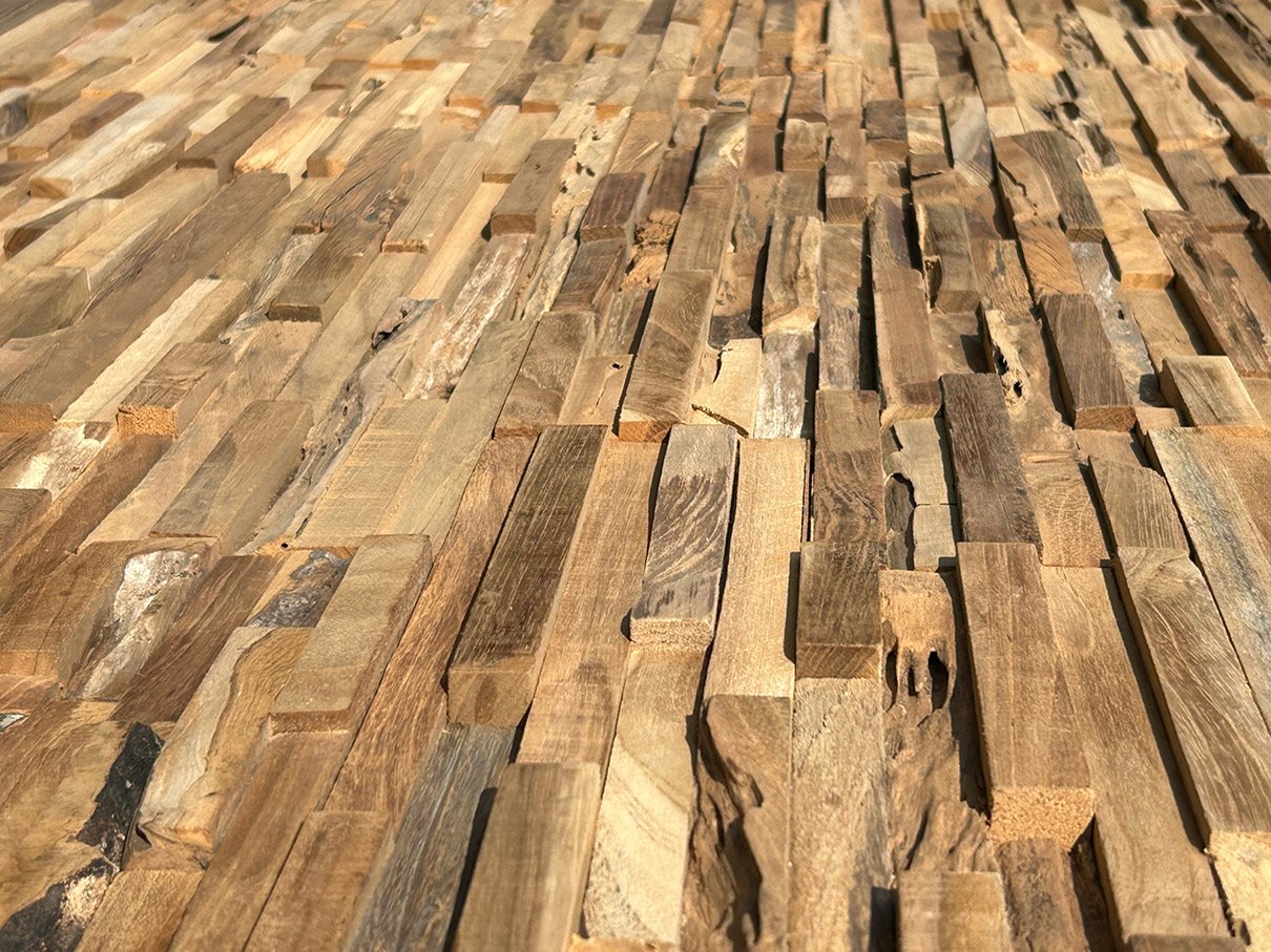 インドネシアの古民家などに使用されていた高級材「チーク」を再利用して製作した商品です。貴重な材料を無駄なく活用するため、職人が手作業で小さなパーツを一つ一つ丁寧に貼り合わせて作り上げた逸品です。様々な形状の木材とチークの高級感から生まれる唯一無二の表情をご堪能下さい。