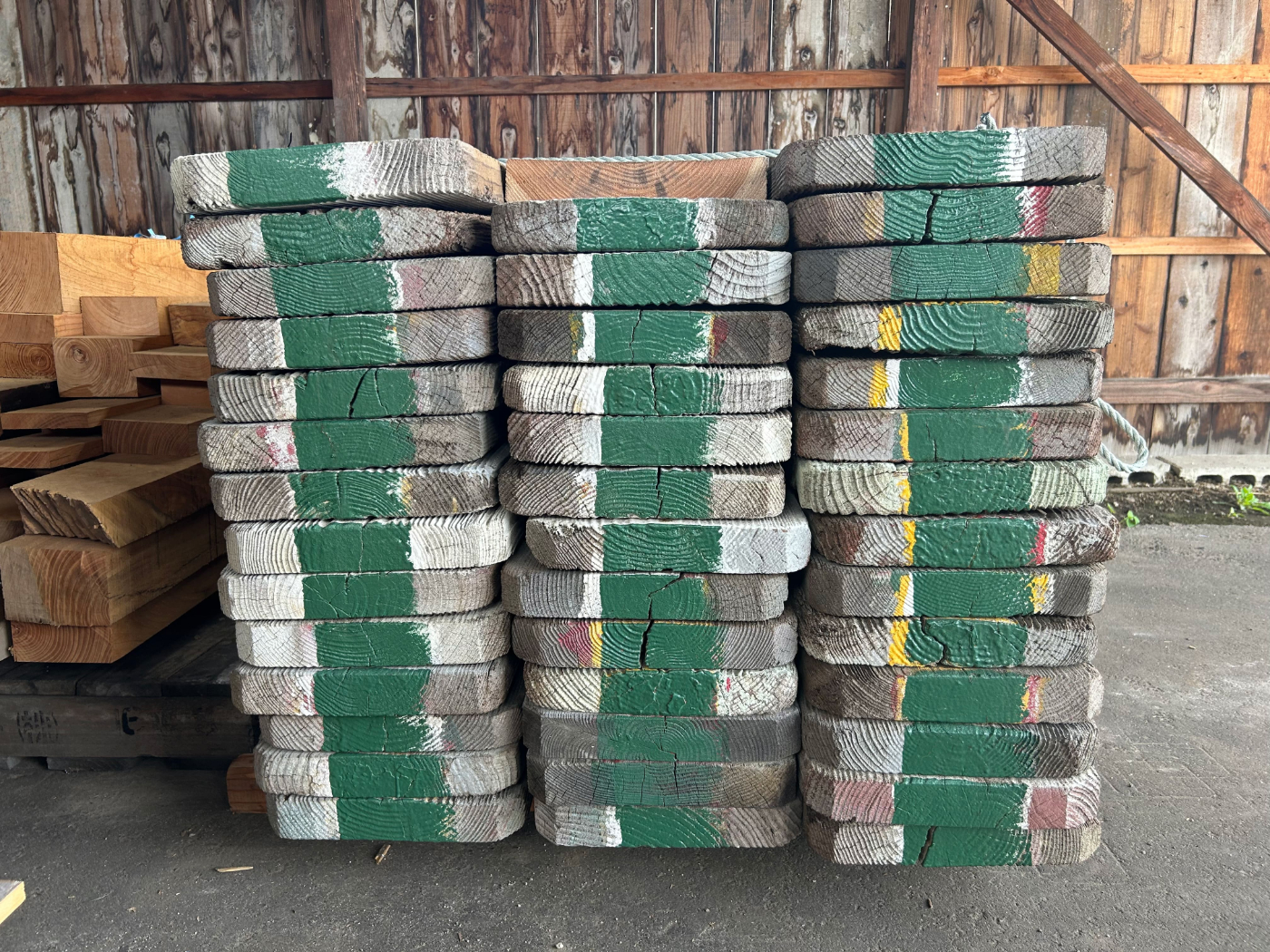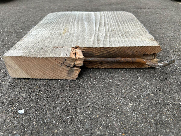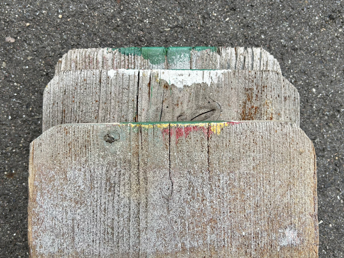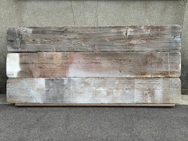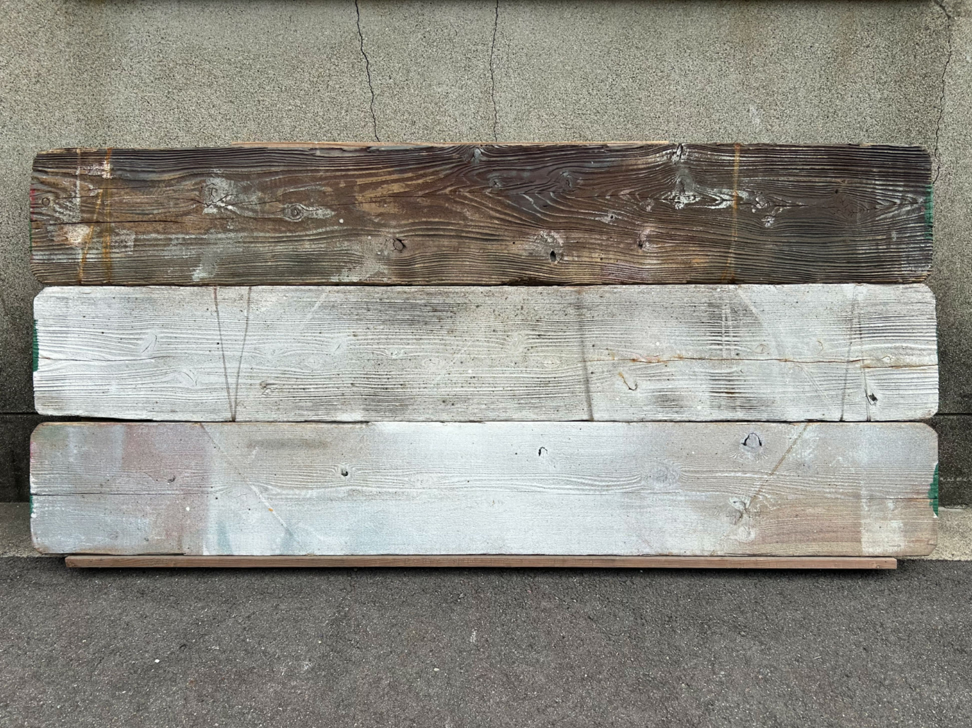 造船の現場において足場板として使用されていた古材です。人や資材の荷重を支えながら、湿気や結露、摩耗といった過酷な環境に耐えてきました。そのため、通常の足場板より厚く幅広で、さらに割れ止めの金具も貫通しています。長年の使用によって生まれた風合いと実用性を併せ持っています。