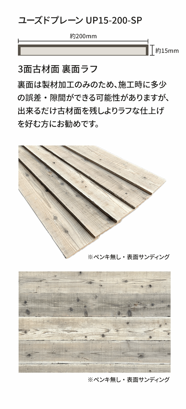 | ユーズドプレーン UP15-200-SP ※2 | 1900 | 200 | 15 | 3面古材面 裏面ラフ | 杉 | 3,040円(税込価格3,344円) |