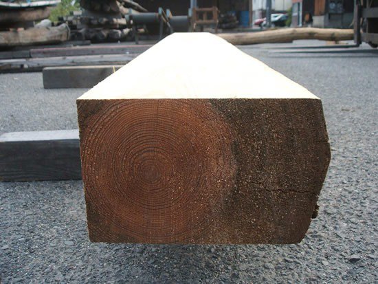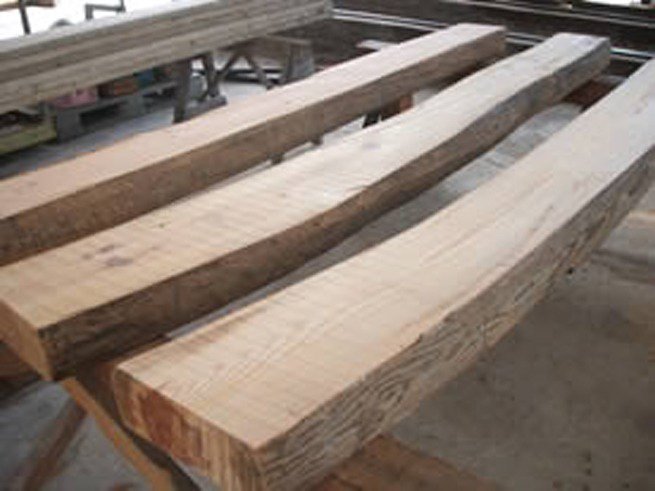丸太の3方を製材(カット)して作られるこの形、実はいろんな用途につかえるのです。付梁、カウンター、框 etc、、、向きを変えていくと、そのイメージが沸いてきます。3方カットしますので、巾、厚みもほぼ思い通りの寸法に仕上げられます。古材面は1面なのですが、その1面が逆に強調され、古材らしい風合いは十分味わえます。古材を使った加工品の製作にもってこいの形です。