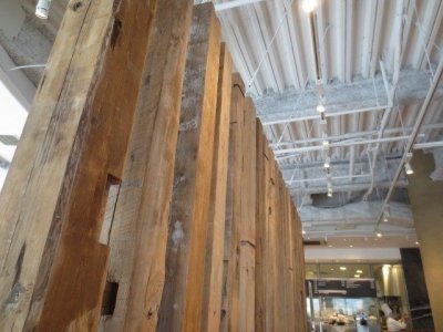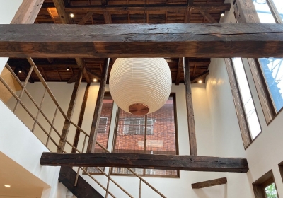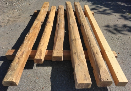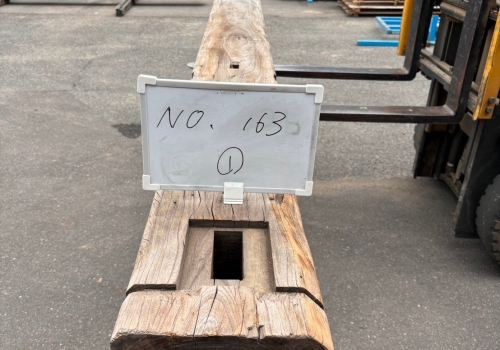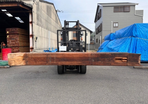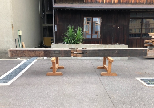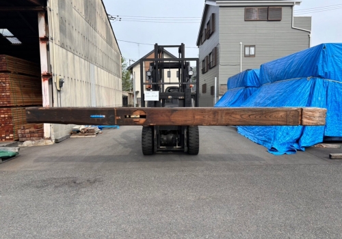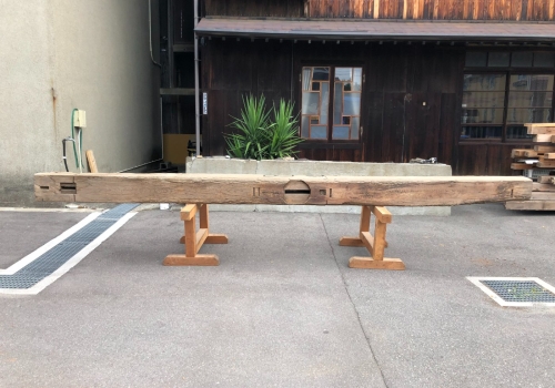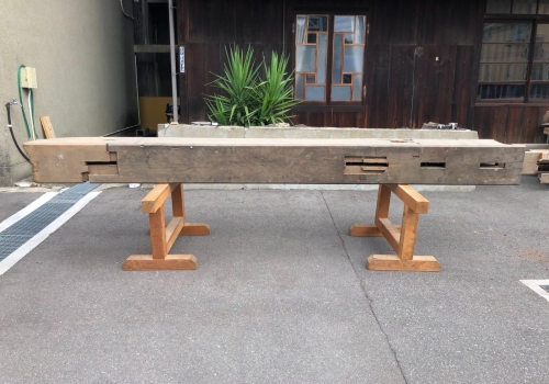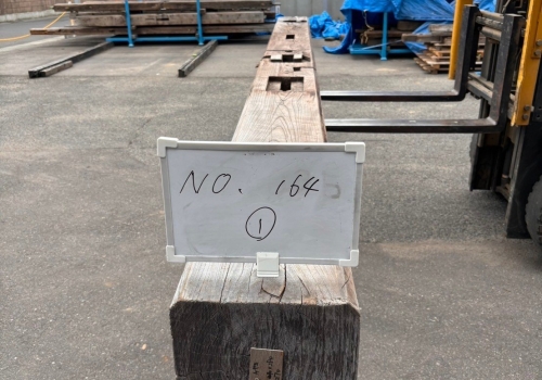 柱材はホゾ穴などの古材ならでは特徴を十分兼ね備え、かつ使いやすいため、非常に人気のある商品です。古民家を支える重要な部材ゆえ梁材とガッチリ組まれており採取が難しい素材ですが、安定供給するため日々コツコツと収集に励んでおります。