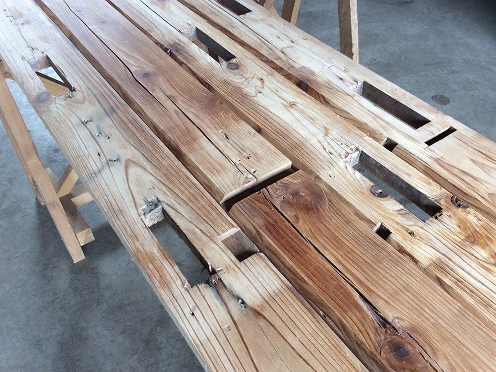 古材を薄くスライスした付梁(つけばり)付柱(つけばしら)です。既存の空間に貼り付けるだけで、最初から古材が埋め込まれているような重厚感ある空間に生まれ変わります。これも古材のもつ本物の質感がそうさせるのです。