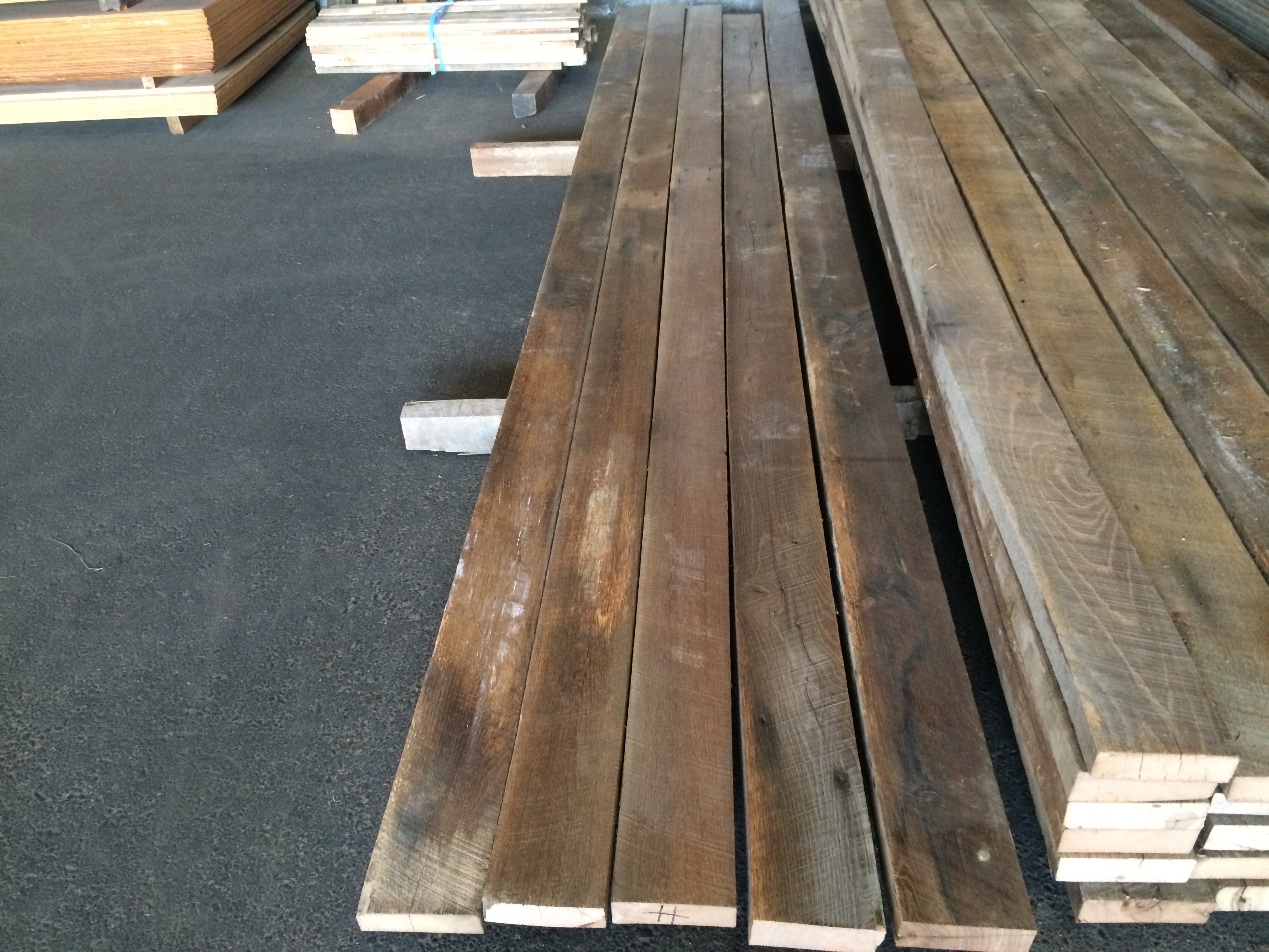たぶん下地に古材を張り付けて制作するのではと思いますが、となりますと薄い古材が必要です。別商品ですが古材オークのフローリング(t19)を使用する方法も考えられます。ただし乱尺品となります。