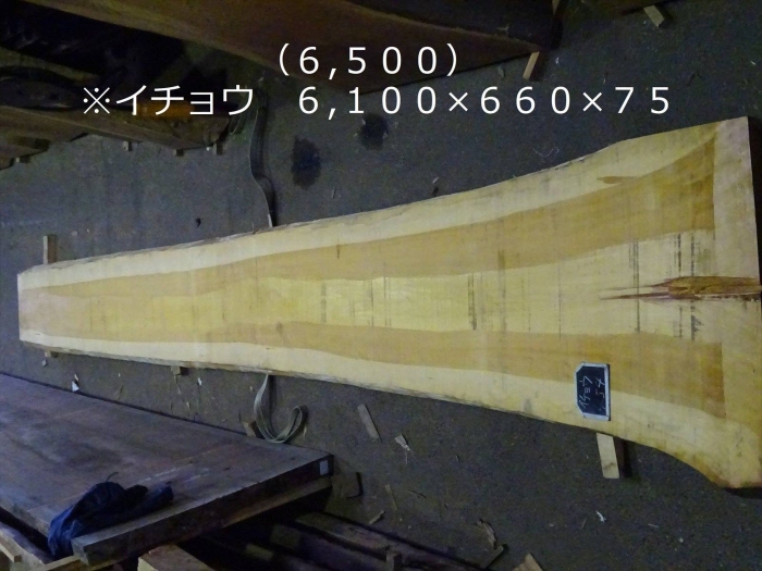 7) イチョウ 6100(6500) x 660 x 75 木表:無地 元1000~中間690~末570巾 元口幅の中ほどに深さ30の傷)