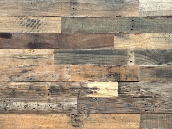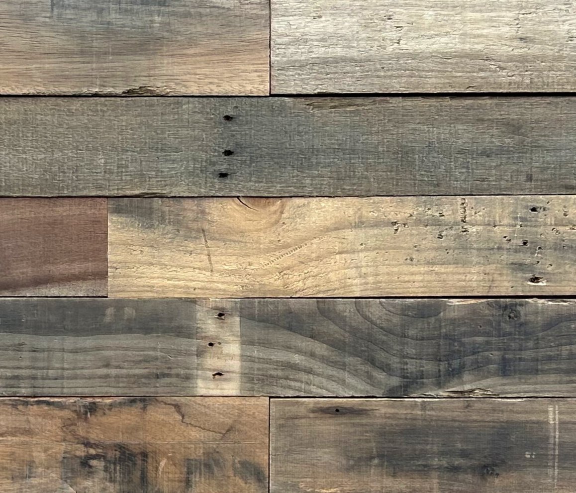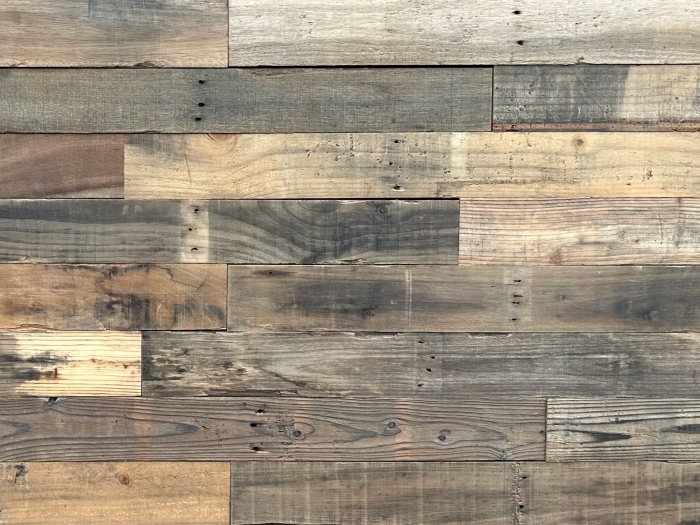 パレット(工場・倉庫・トラックなどの荷物を載せる台のこと)として実際に使われていた木材です。適度な風化と荷物の輸送中についた傷跡が特徴の素材です。