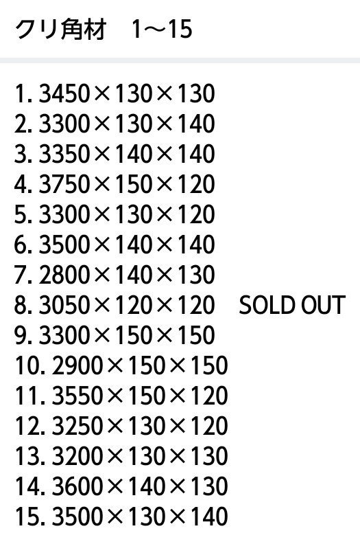 電話でお問い合わせいただく際は「TO240910 国産クリ角材 1~15」とお問い合わせください。