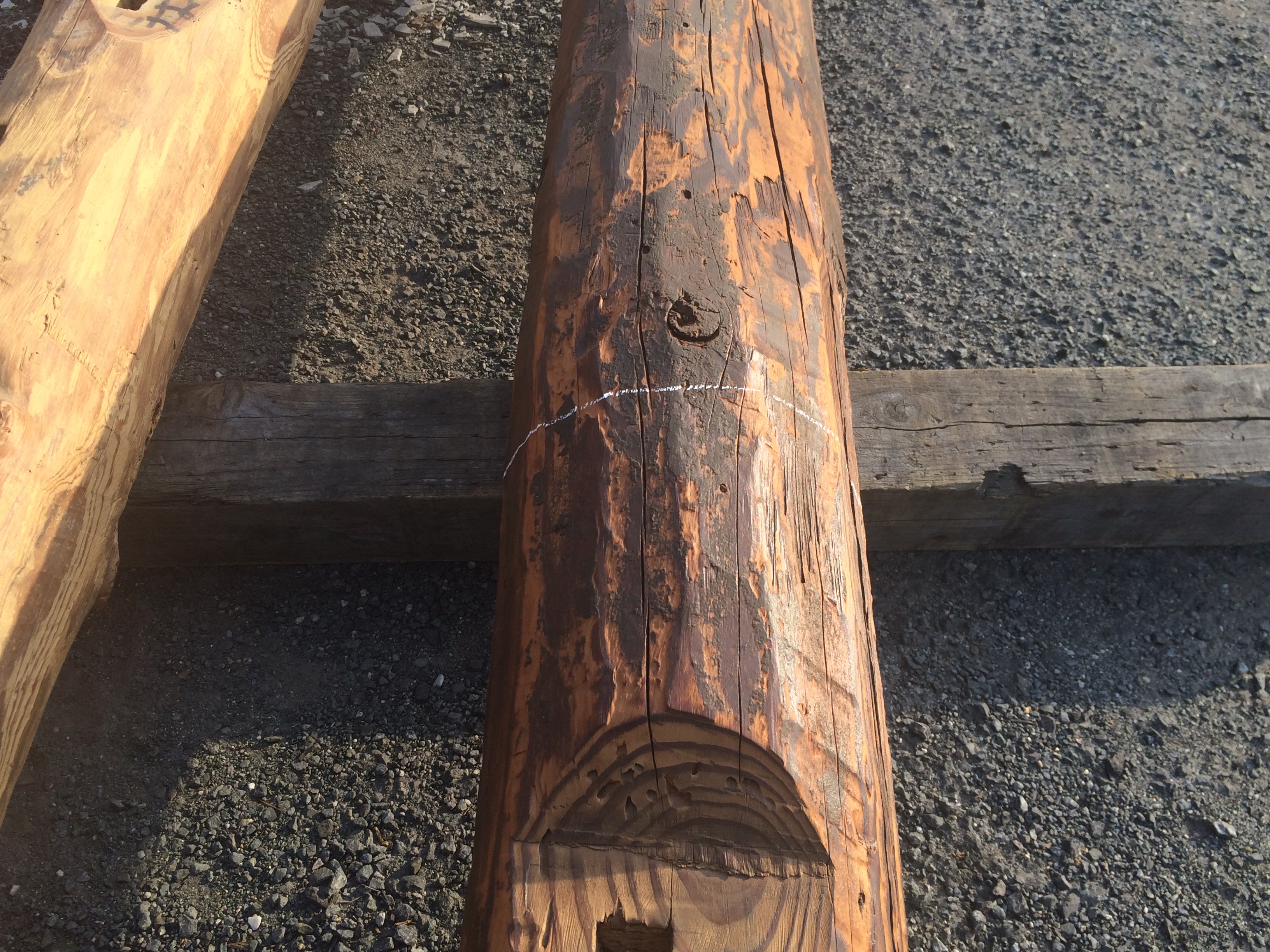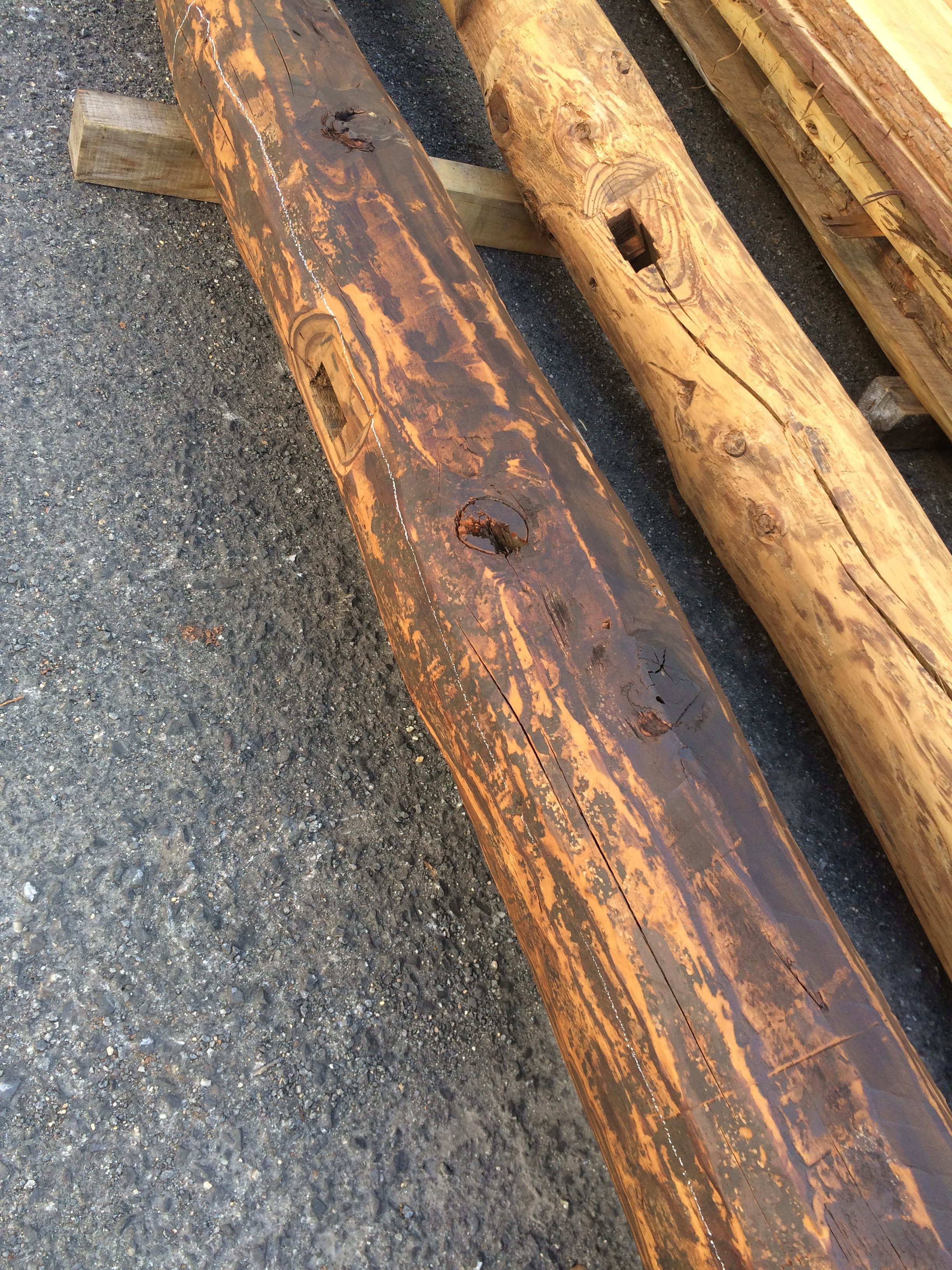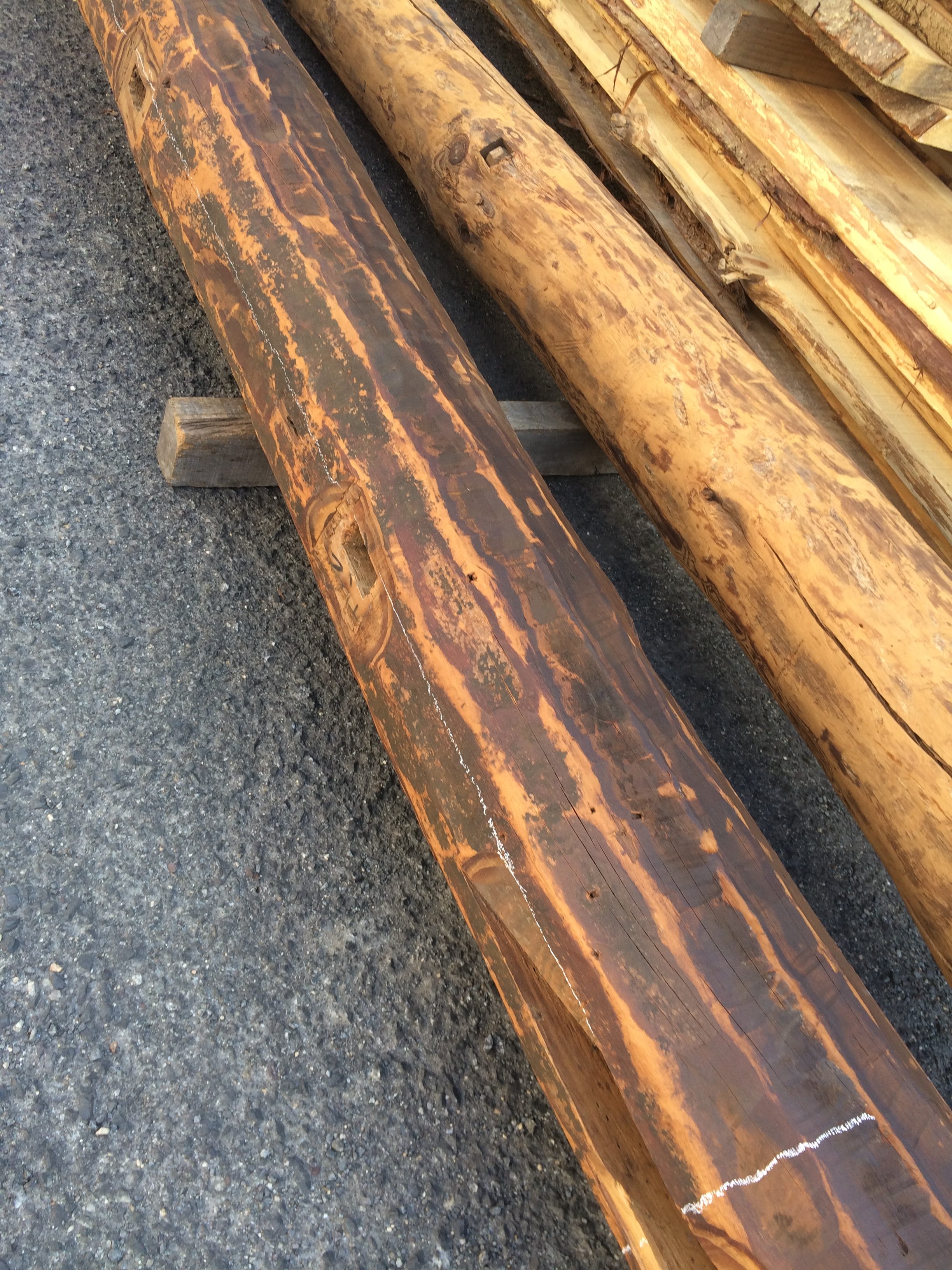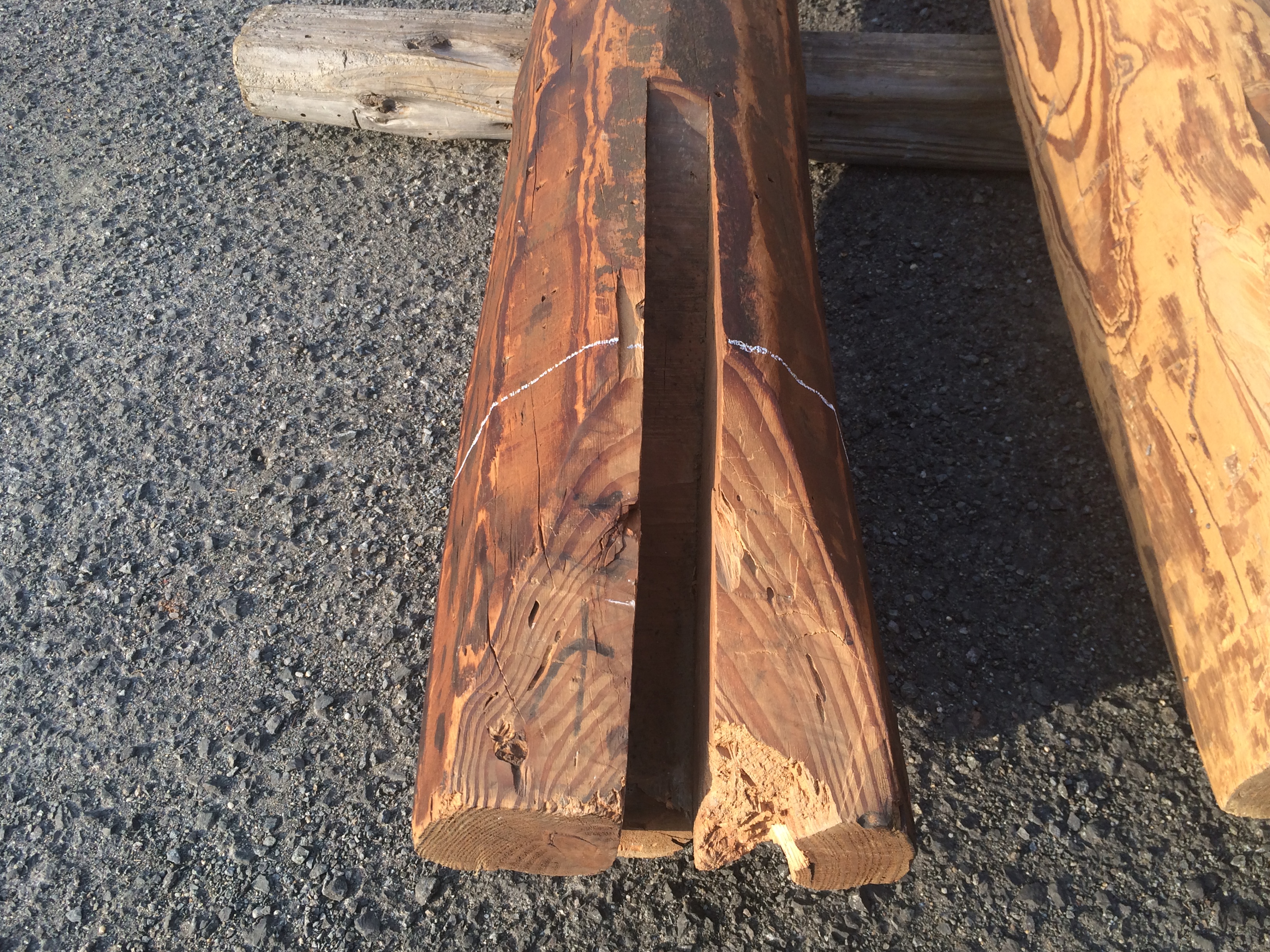 ホゾ穴は少ないですが、少し割れが見えますね。ただ古材では当たり前の割れの大きさです。また、右端(右写真)の方は、チョークのラインが少し平らな面にかかっています。好みの問題ですが平らな面が不要であれば、もう少し左側へ寄せて木取りします。↓