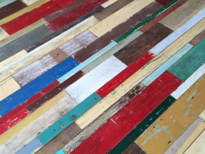 色合いは レッド・クリーム ブルー・グリーン ミックス の3種類。薄いパネル仕上げは什器や壁に使い易く、ポップな色彩と素材の高級感がトロピカルチークパネルの魅力です。