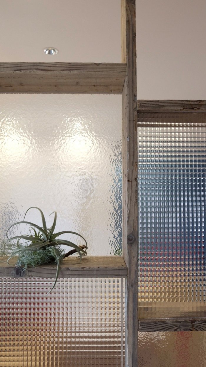 パーテーションを兼ねた古材の棚板は、全面にガラスをいれず空間の奥行を感じさせます。