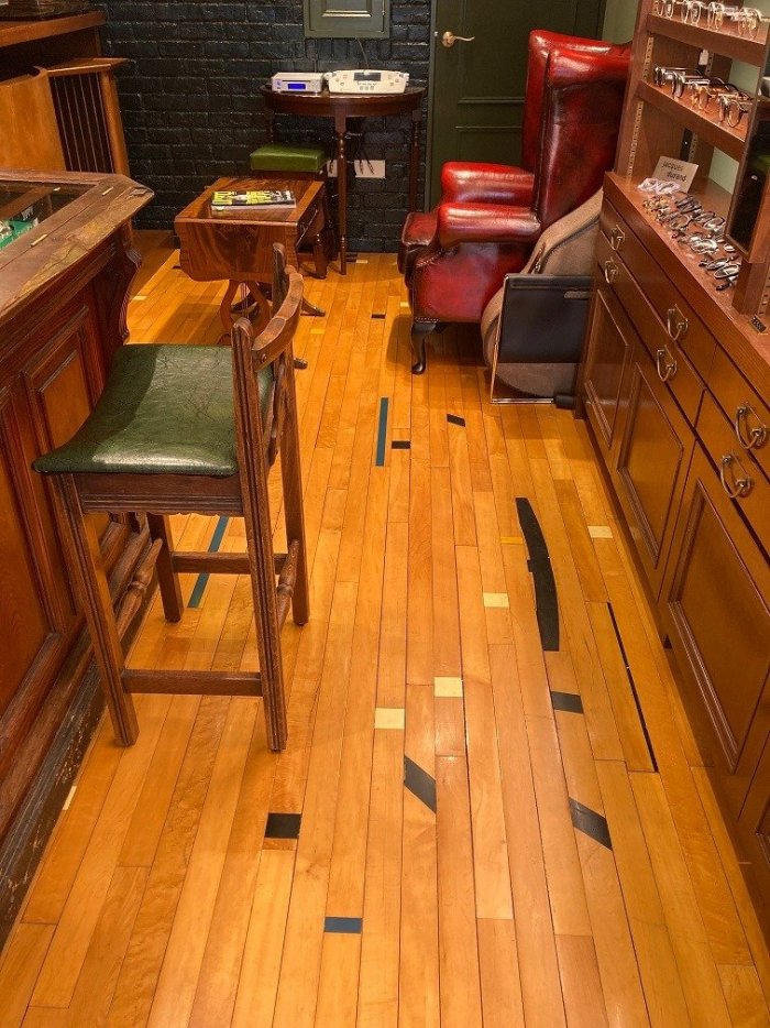 ヴィンテージサウンドを体感できる新感覚の眼鏡店。 ヴィンテージオーディオ機器とジムフローリングの組み合わせが目を惹く店舗です。