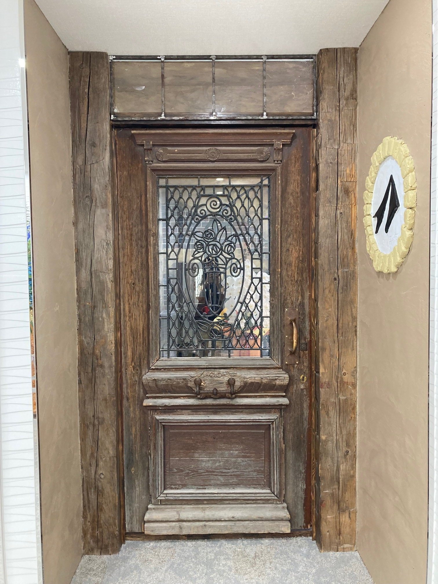オーナー様拘りのアンティークドアの奥に広がるオークフローリング。 ヘリンボーンを真っすぐに貼るとまた違ったイメージに。